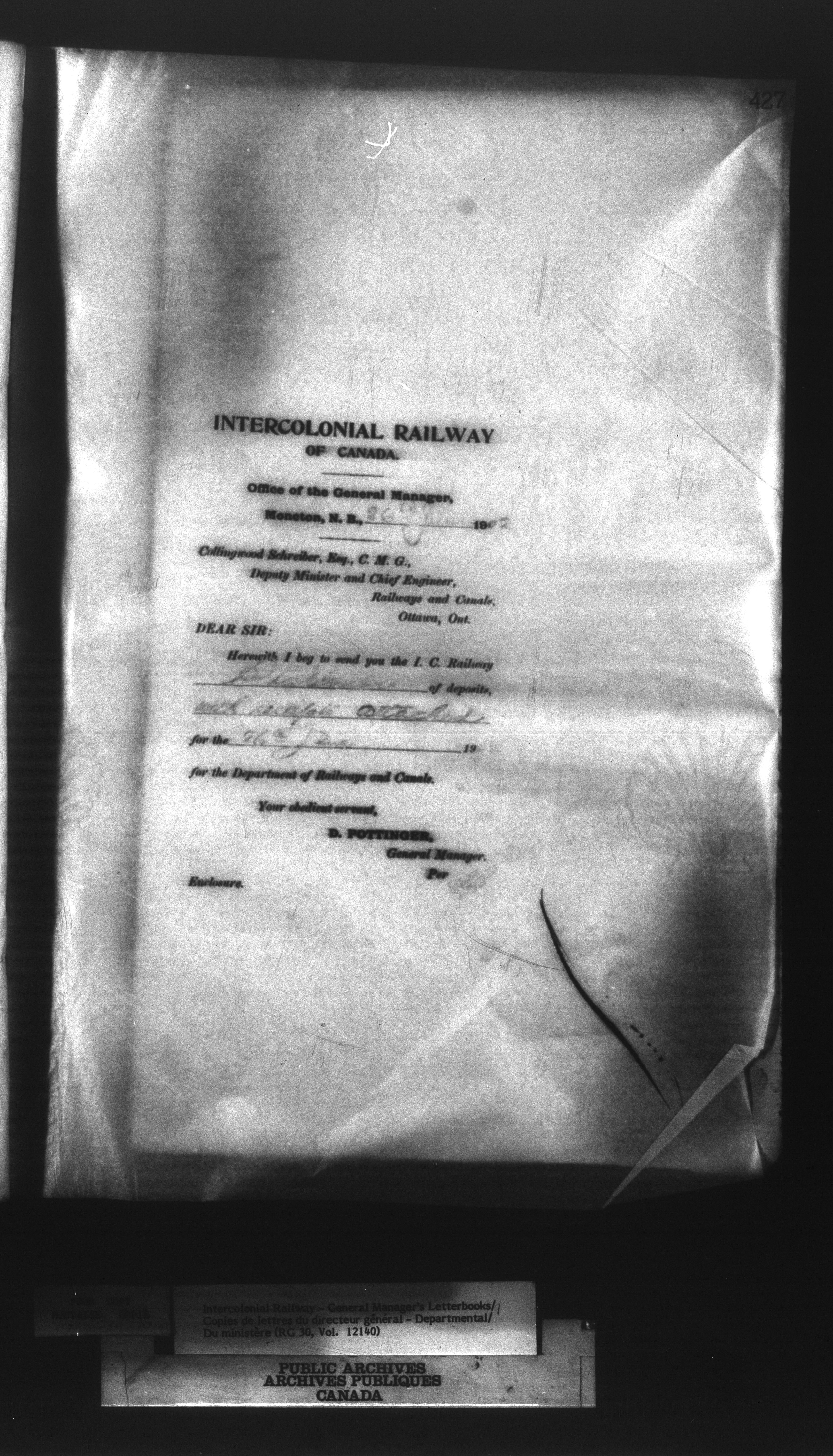 Canadian Government Railways : Office of the General Manager, Outward correspondence with Department of Railways and Canals, 1893-1913 - 12474
