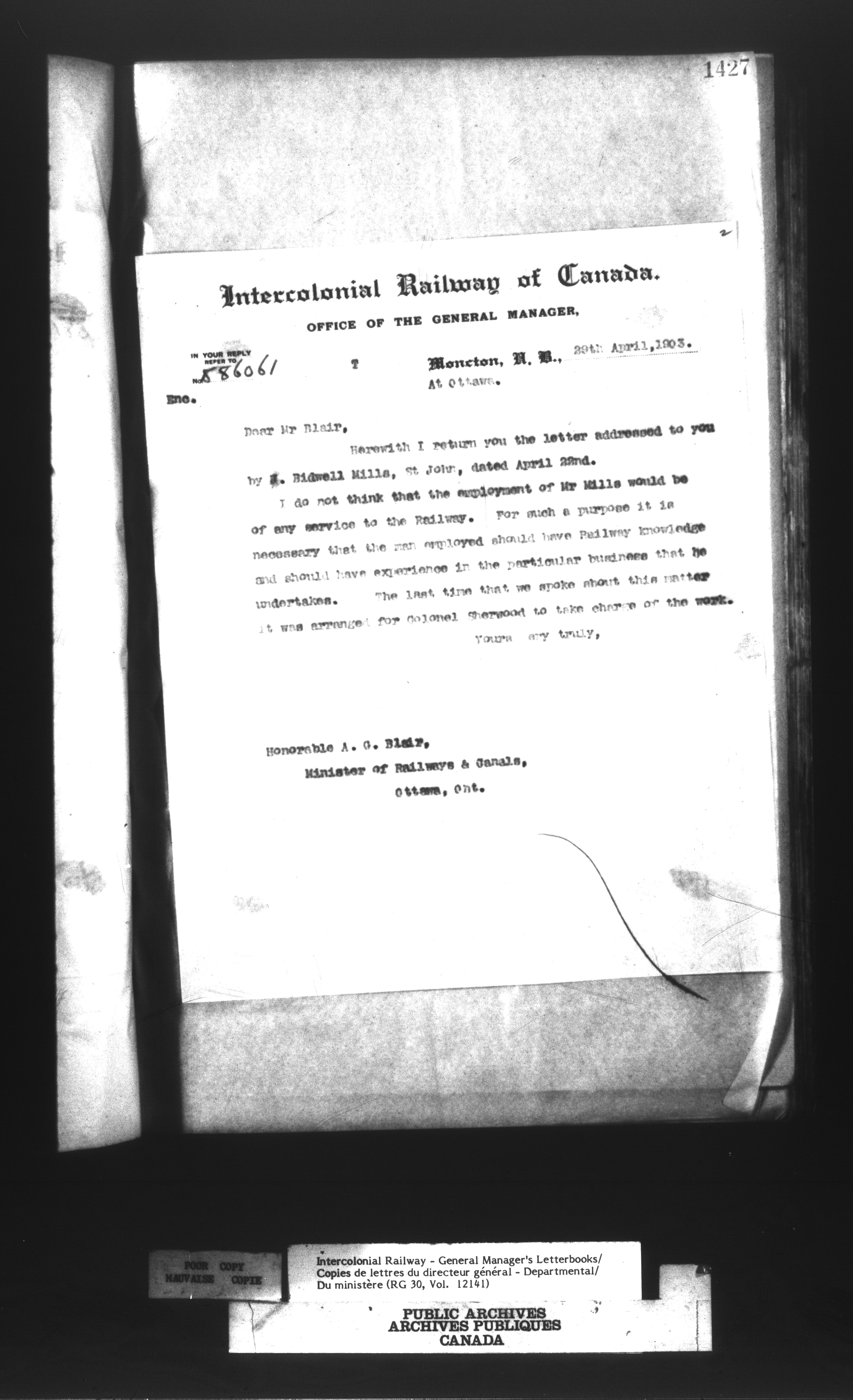 Canadian Government Railways : Office of the General Manager, Outward correspondence with Department of Railways and Canals, 1893-1913 - 12476