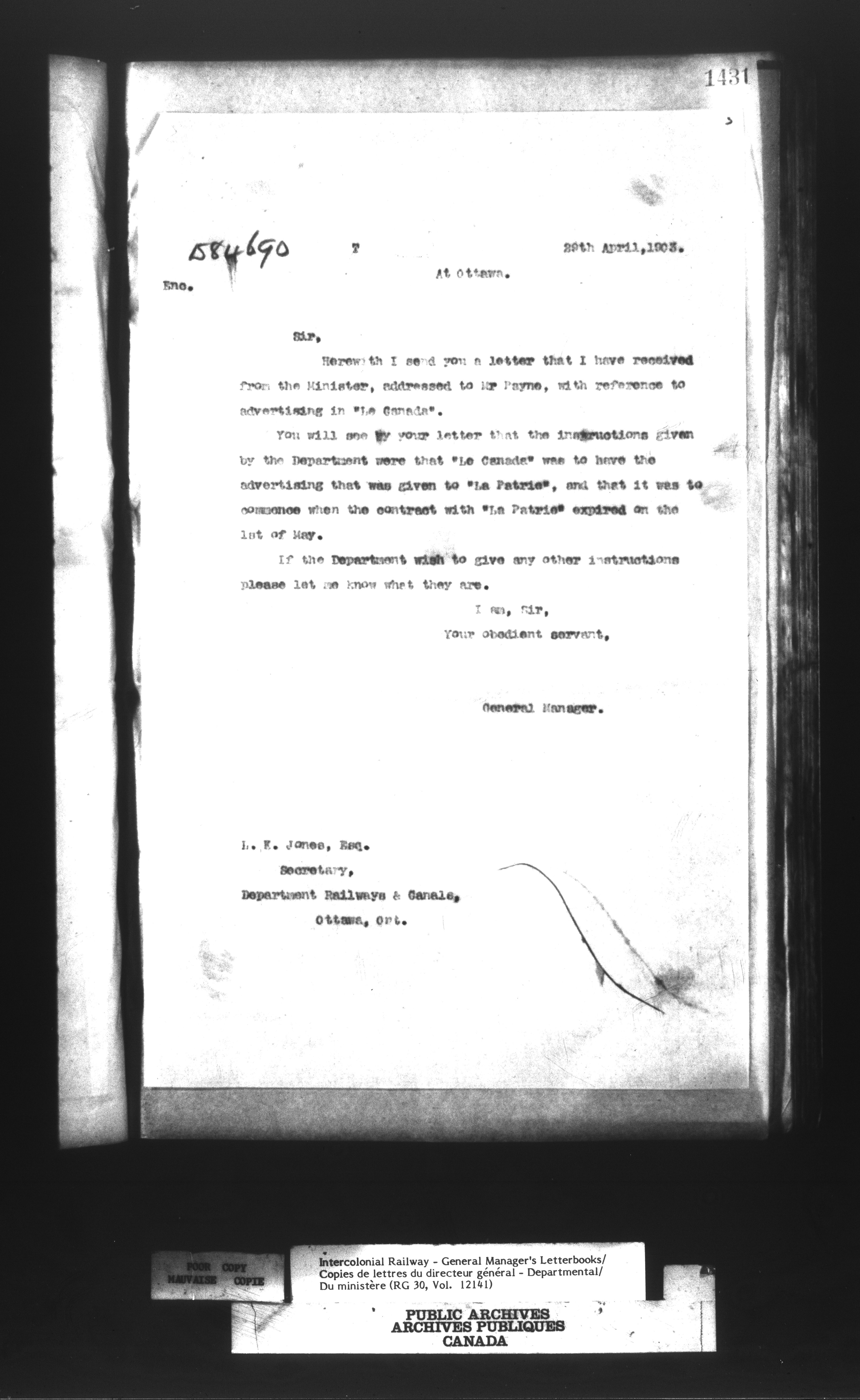 Canadian Government Railways : Office of the General Manager, Outward correspondence with Department of Railways and Canals, 1893-1913 - 12476
