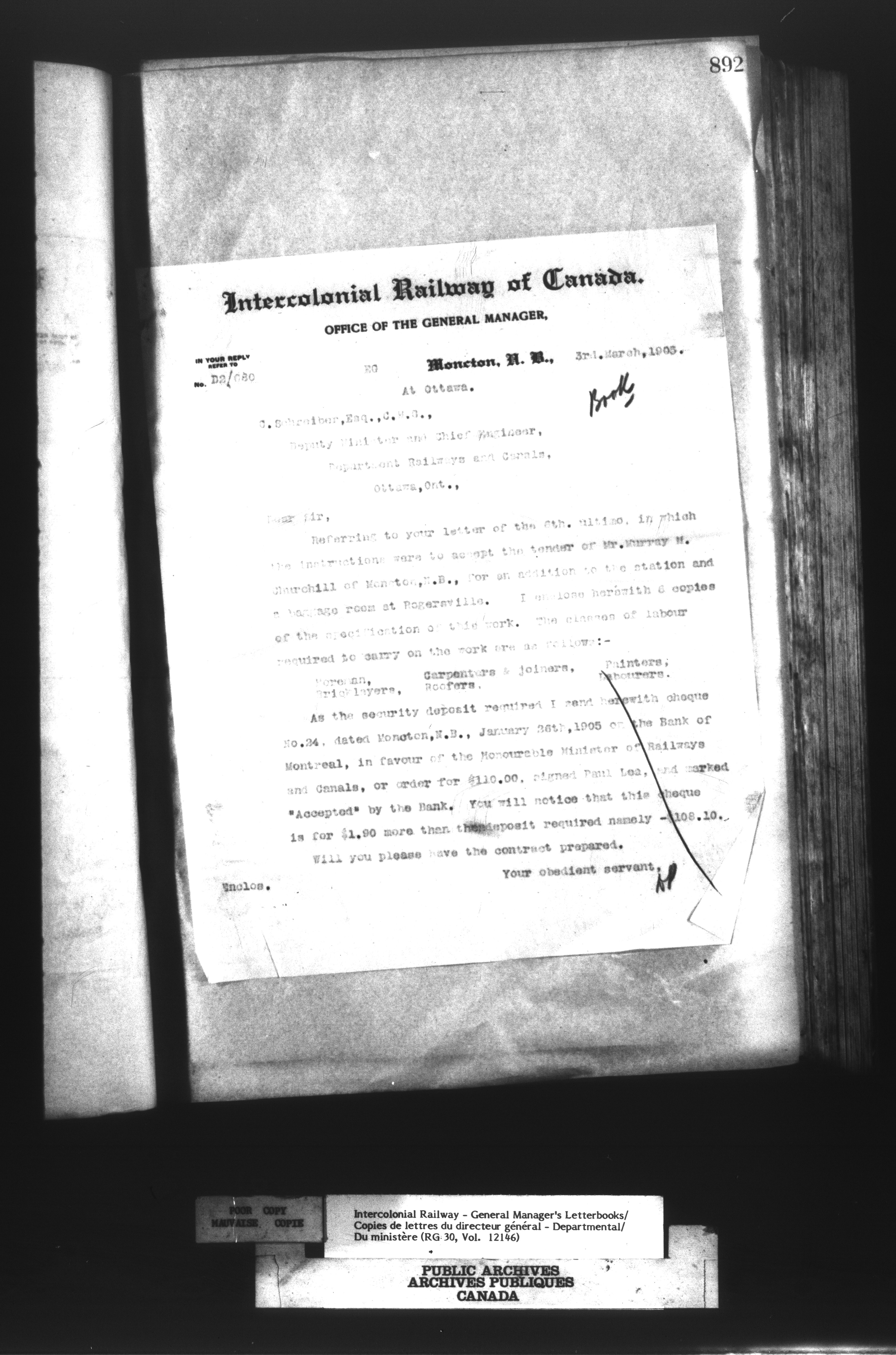 Canadian Government Railways : Office of the General Manager, Outward correspondence with Department of Railways and Canals, 1893-1913 - 12481