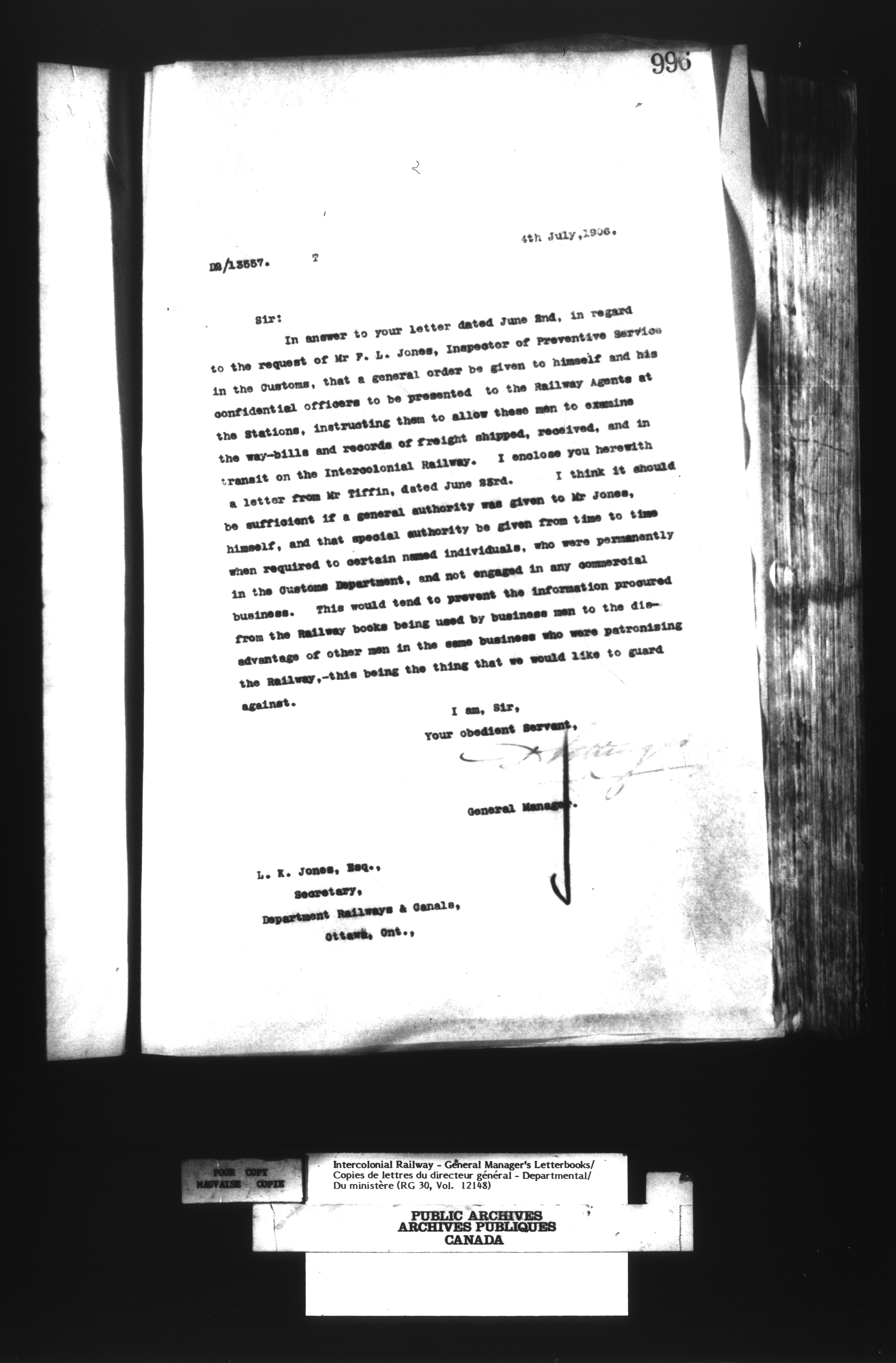 Canadian Government Railways : Office of the General Manager, Outward correspondence with Department of Railways and Canals, 1893-1913 - 12483