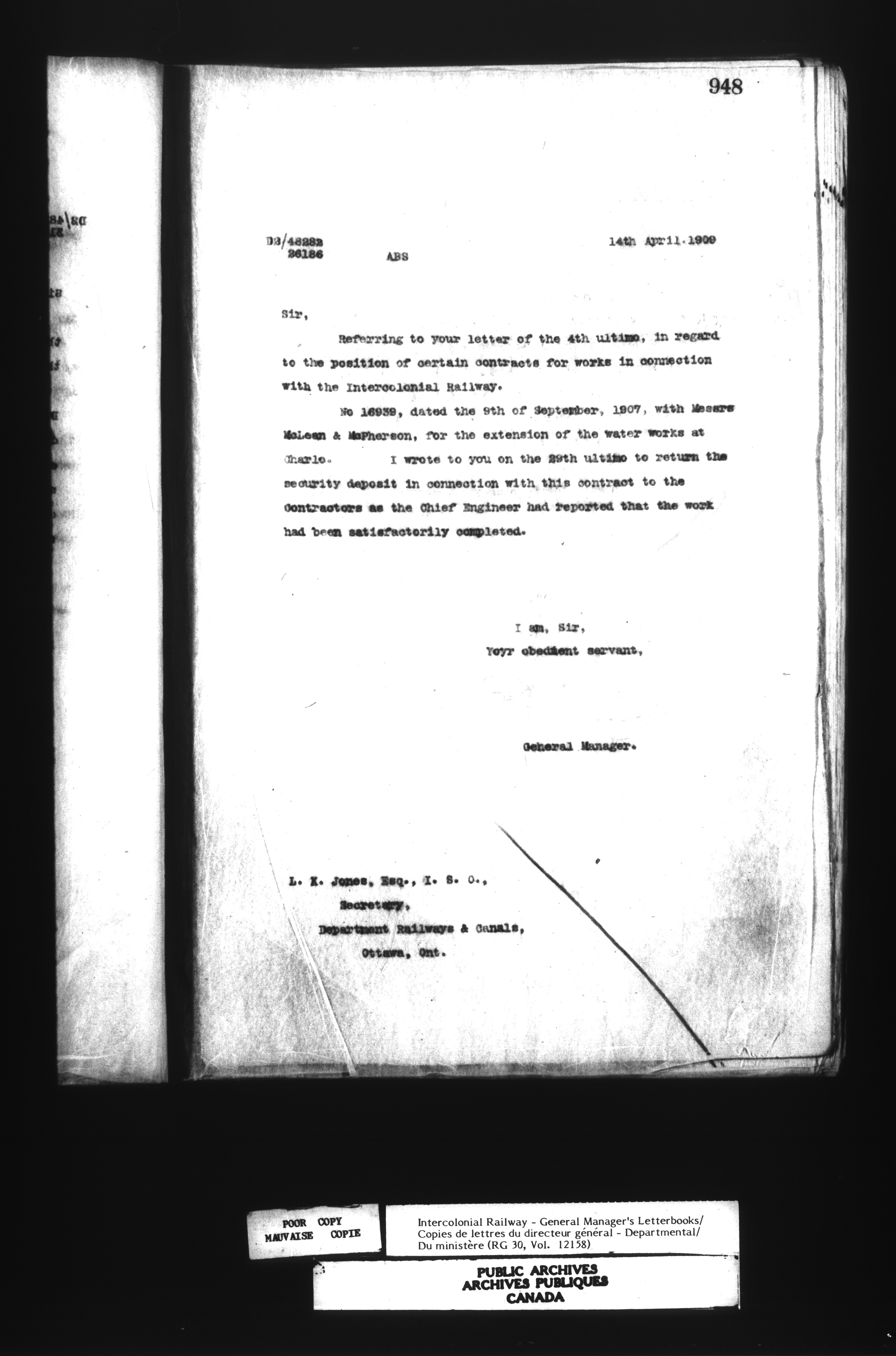 Canadian Government Railways : Office of the General Manager, Outward correspondence with Department of Railways and Canals, 1893-1913 - 12492