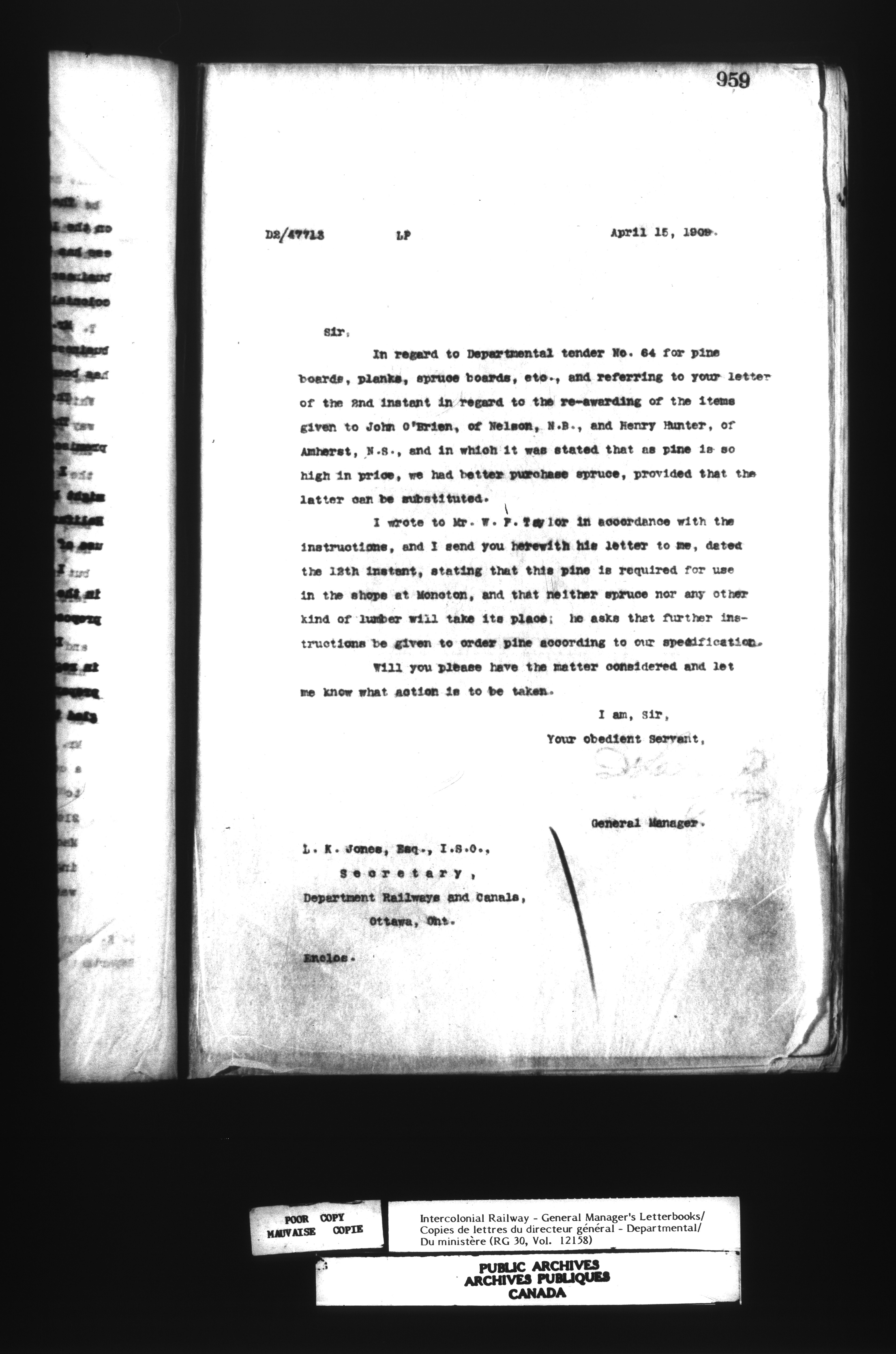 Canadian Government Railways : Office of the General Manager, Outward correspondence with Department of Railways and Canals, 1893-1913 - 12492