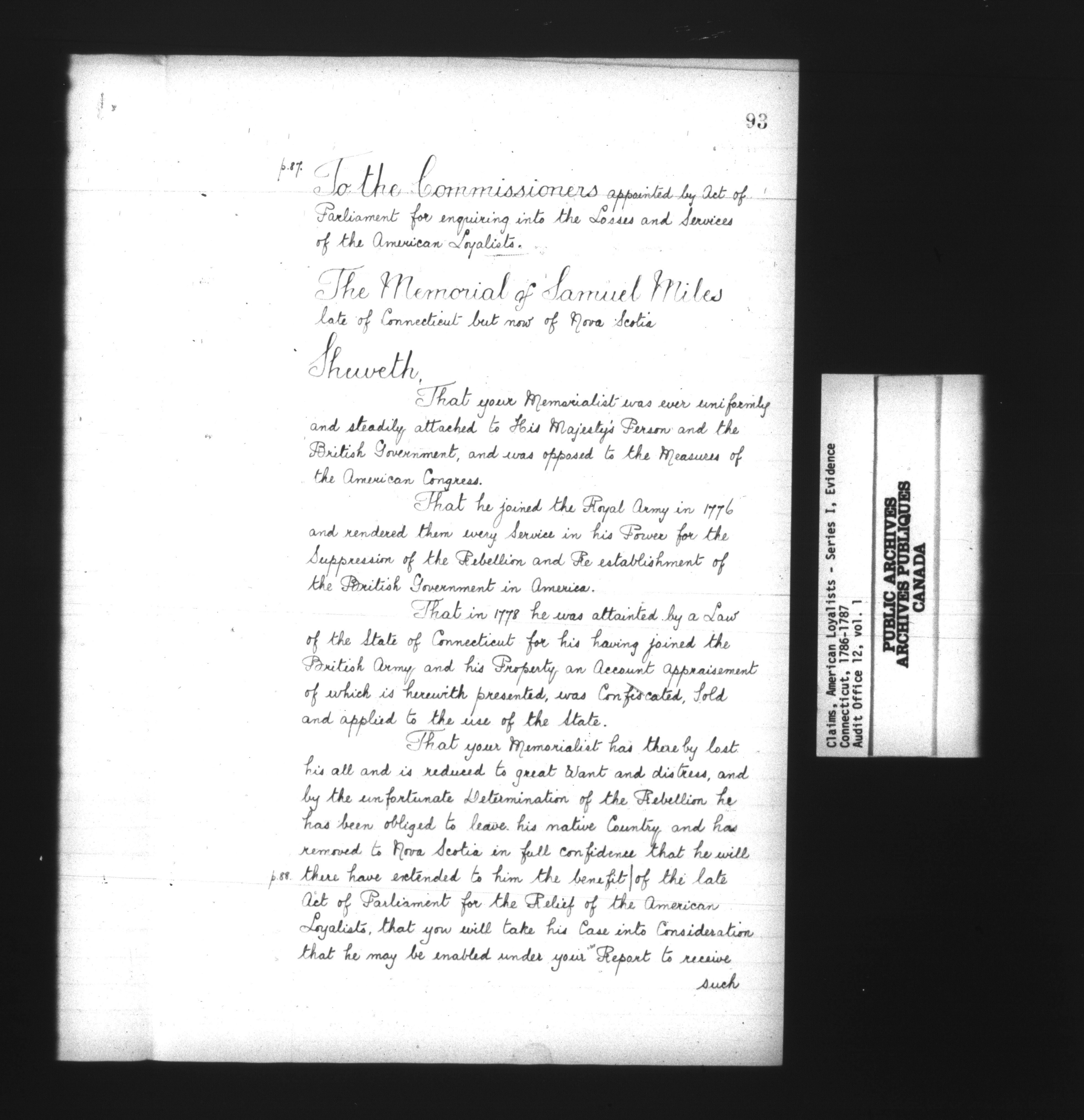 Audit Office : AO 12. Claims, American Loyalists - Series I : C-12903