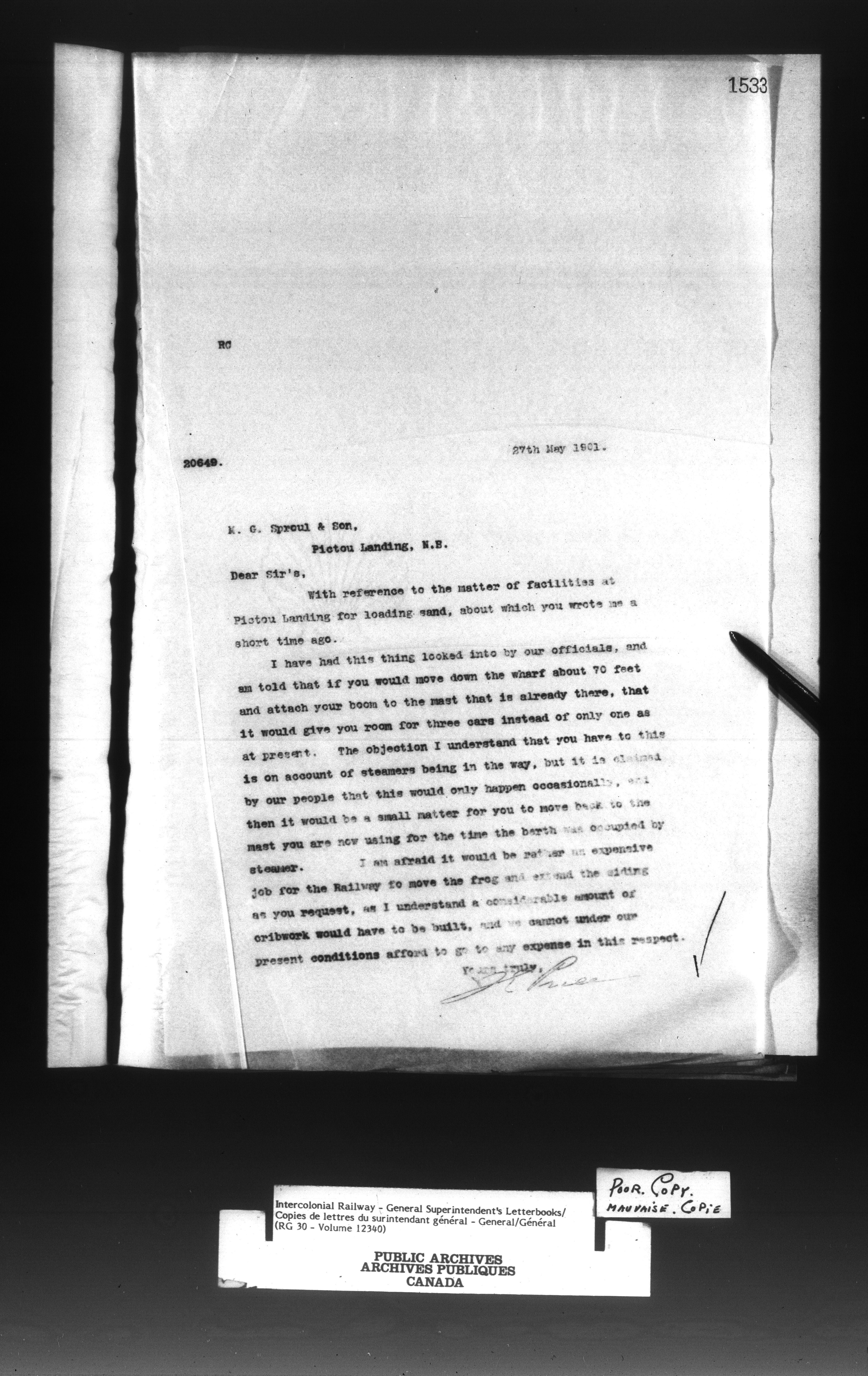 Canadian Government Railways : Office of the General Superintendent correspondence : C-13033