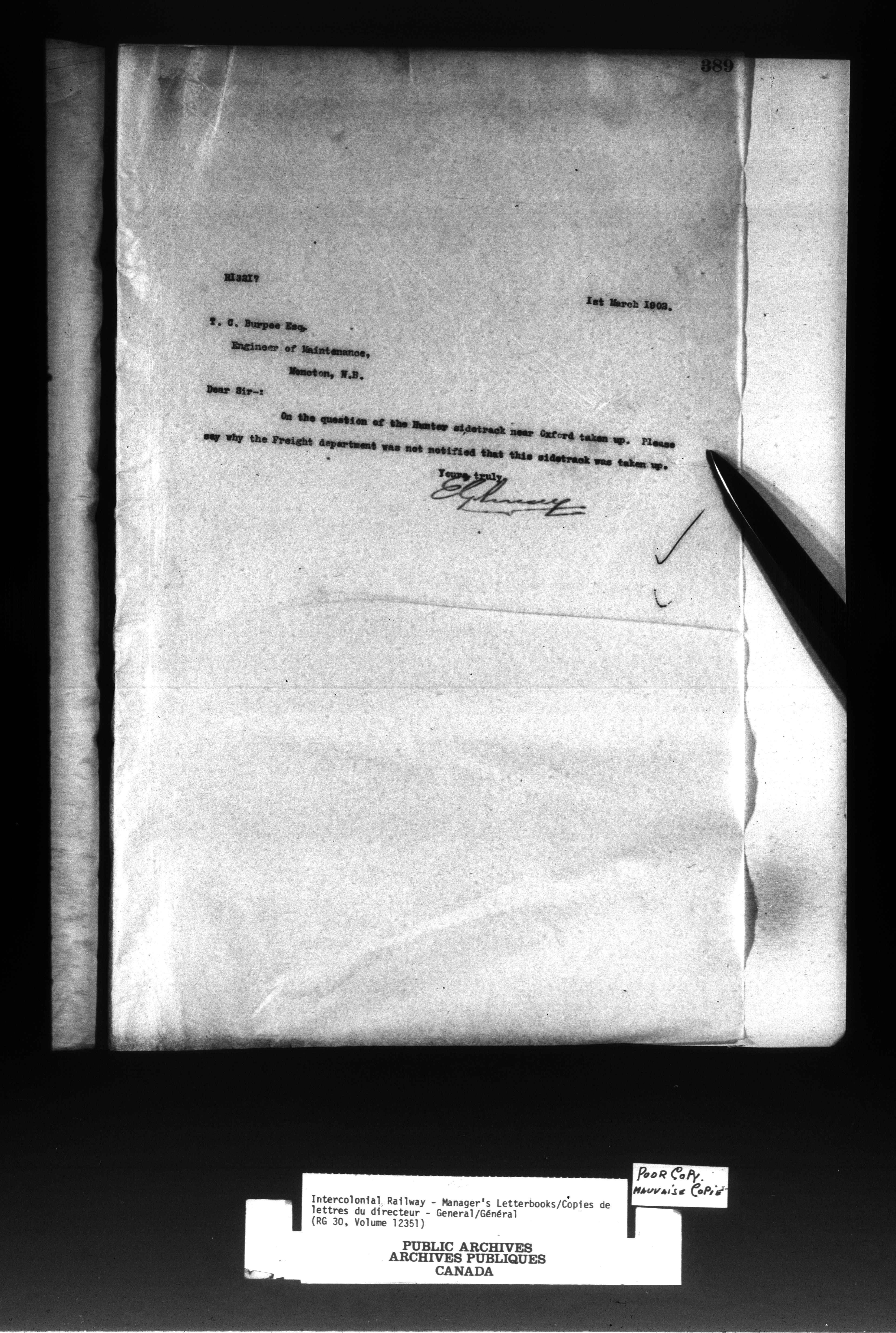 Canadian Government Railways : Office of the Manager, Outward correspondence : C-13046