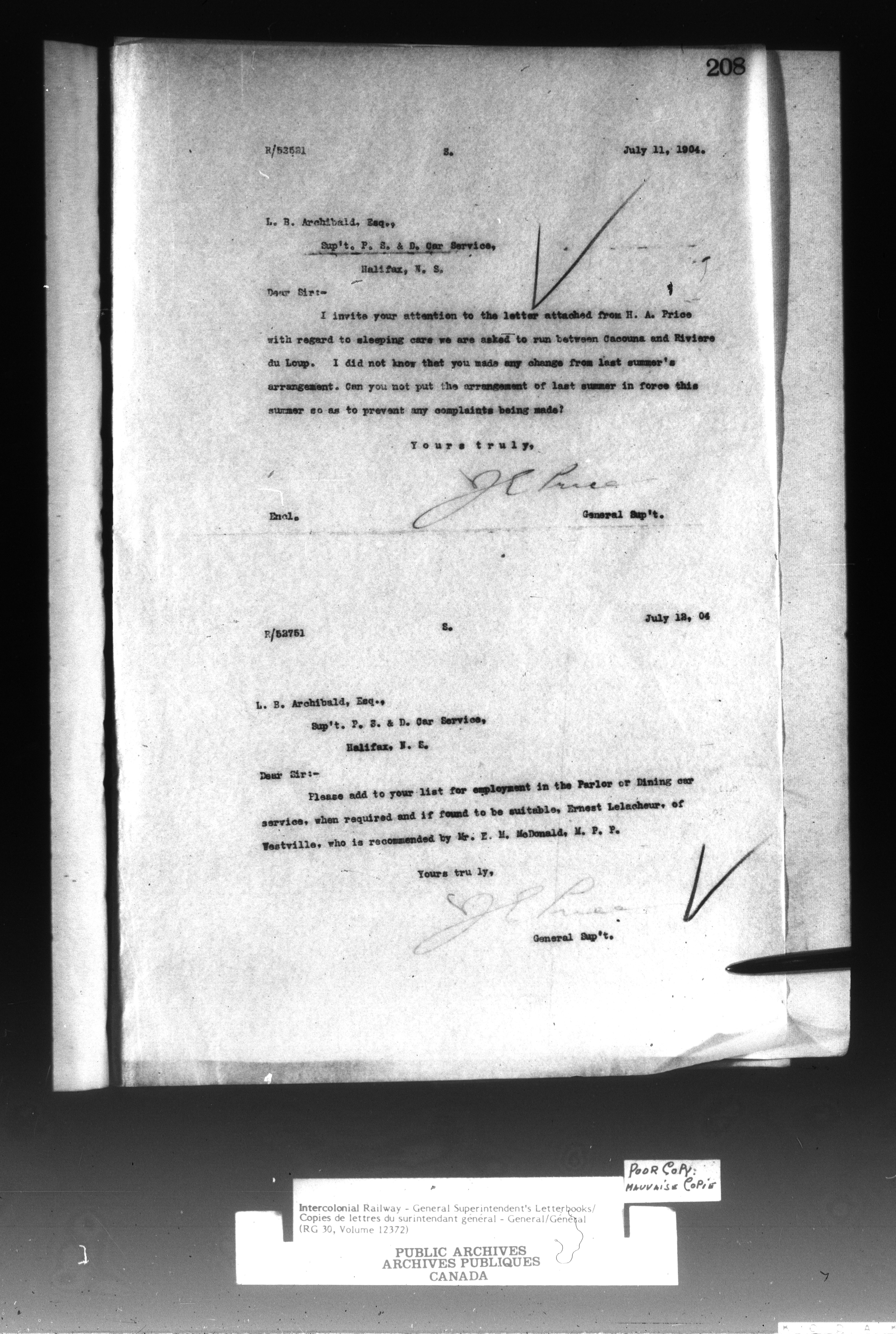 Canadian Government Railways : Office of the General Superintendent correspondence : C-13296