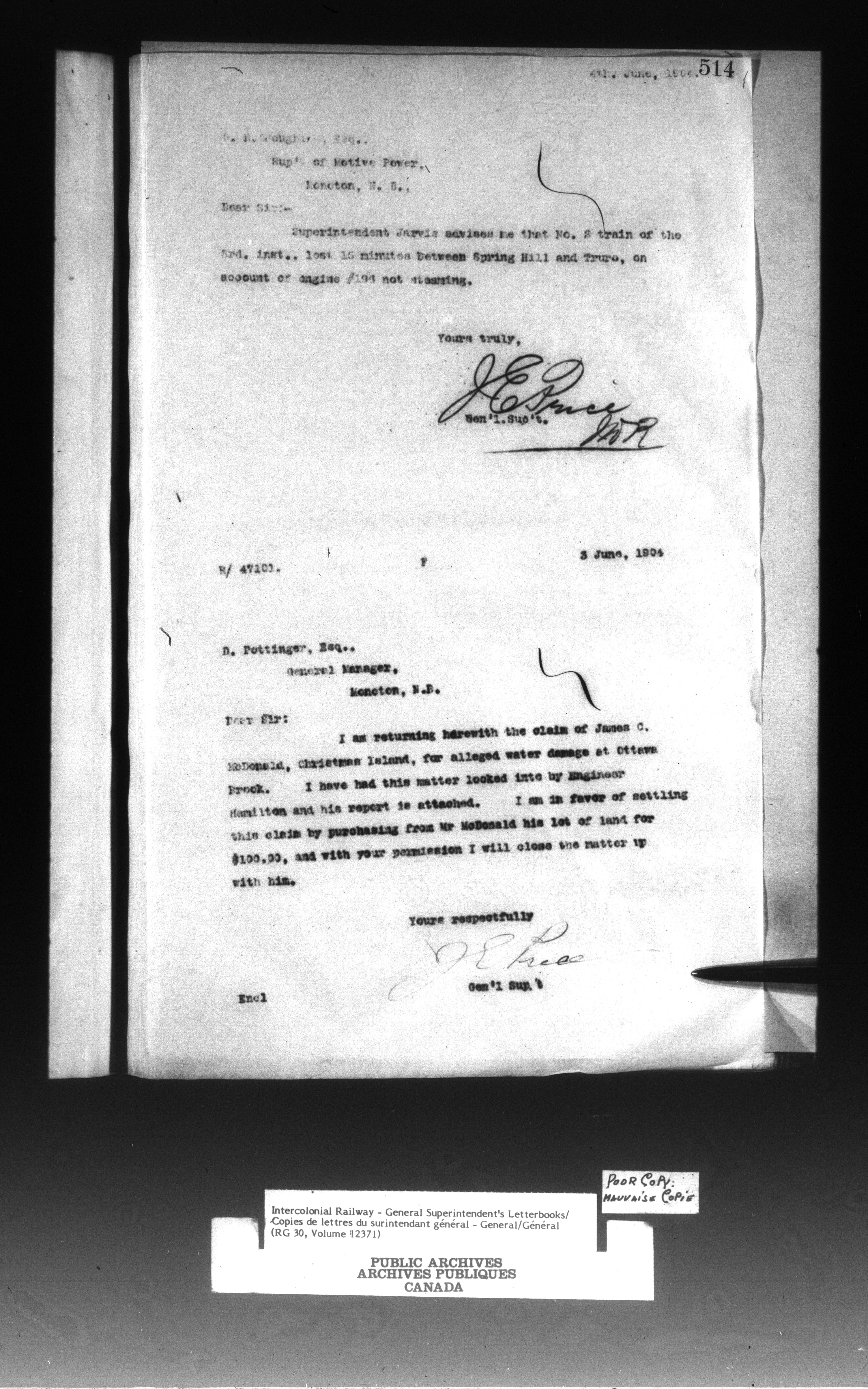 Canadian Government Railways : Office of the General Superintendent correspondence : C-13296