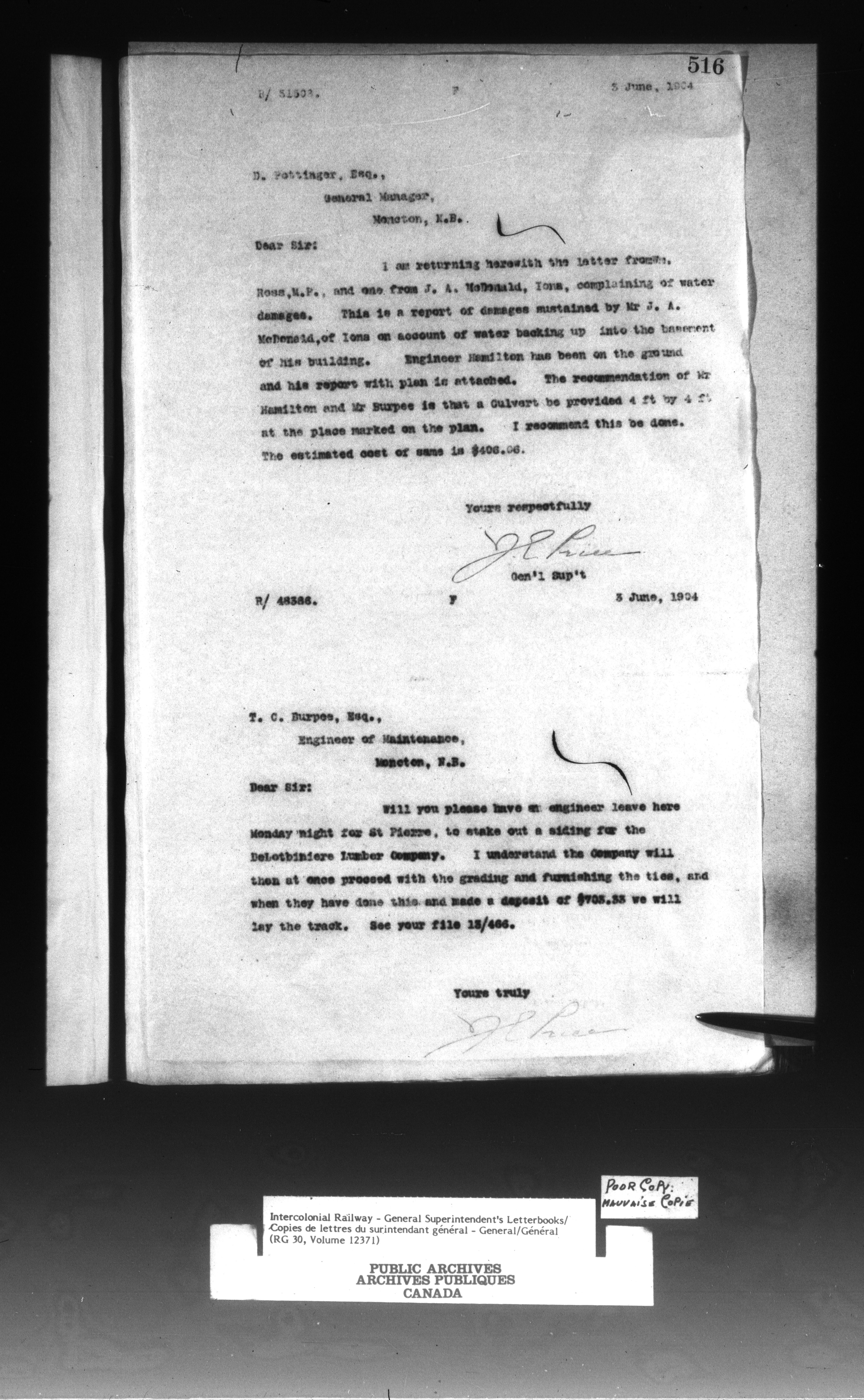 Canadian Government Railways : Office of the General Superintendent correspondence : C-13296