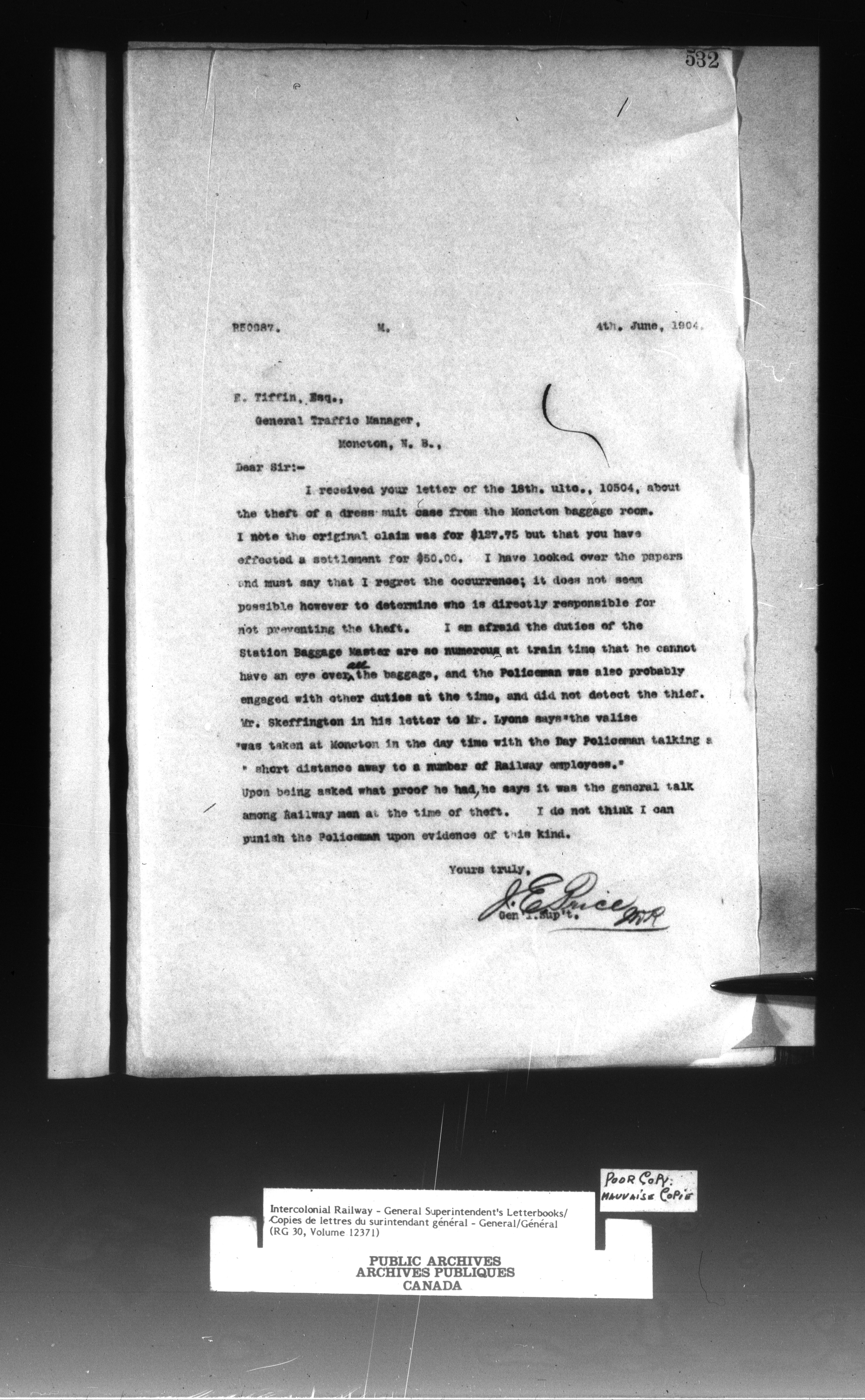 Canadian Government Railways : Office of the General Superintendent correspondence : C-13296
