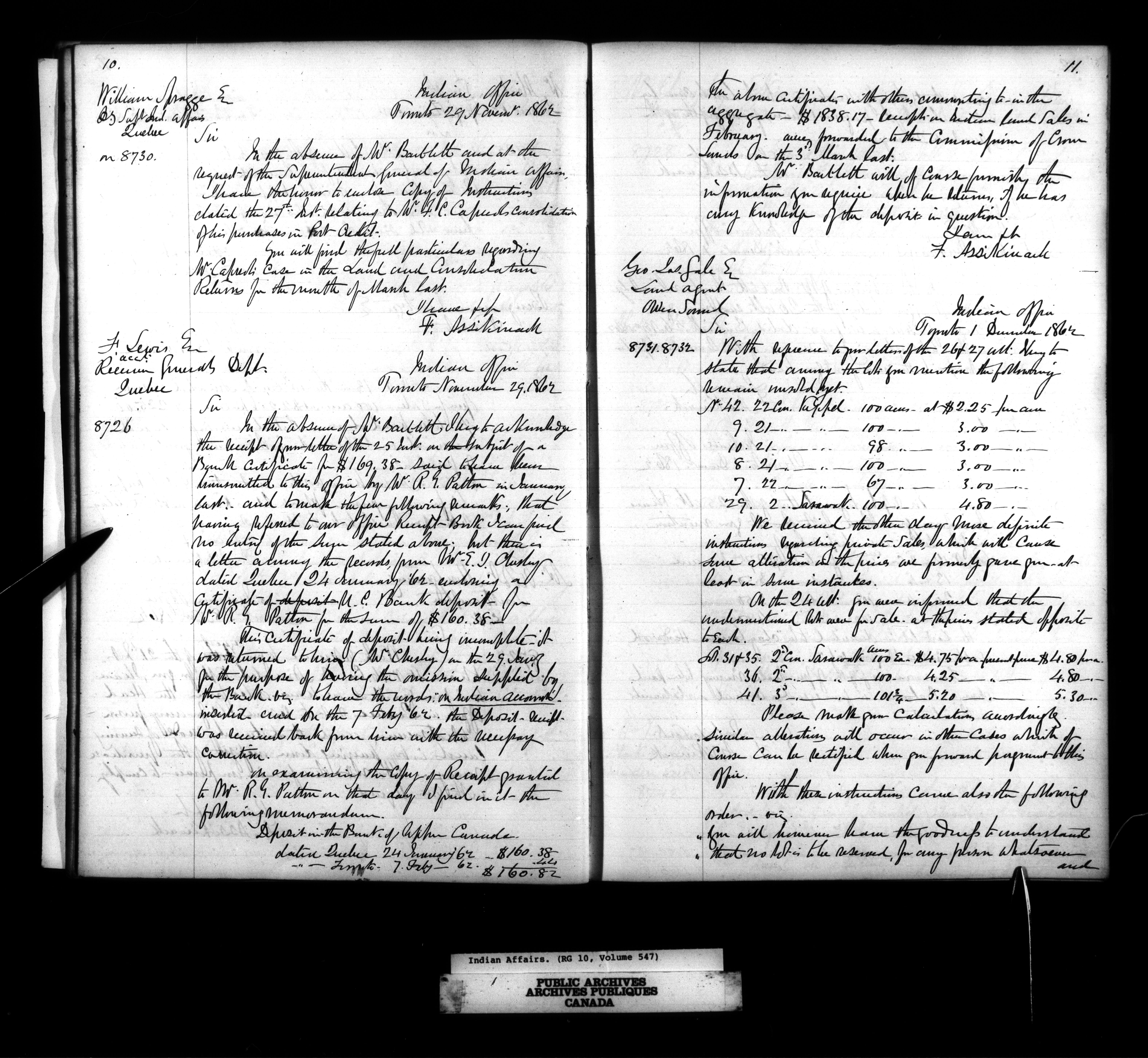 Department of Indian Affairs, Toronto office of the Central Superintendency : Superintendent William R. Bartlet's Indexed letterbooks - 13359