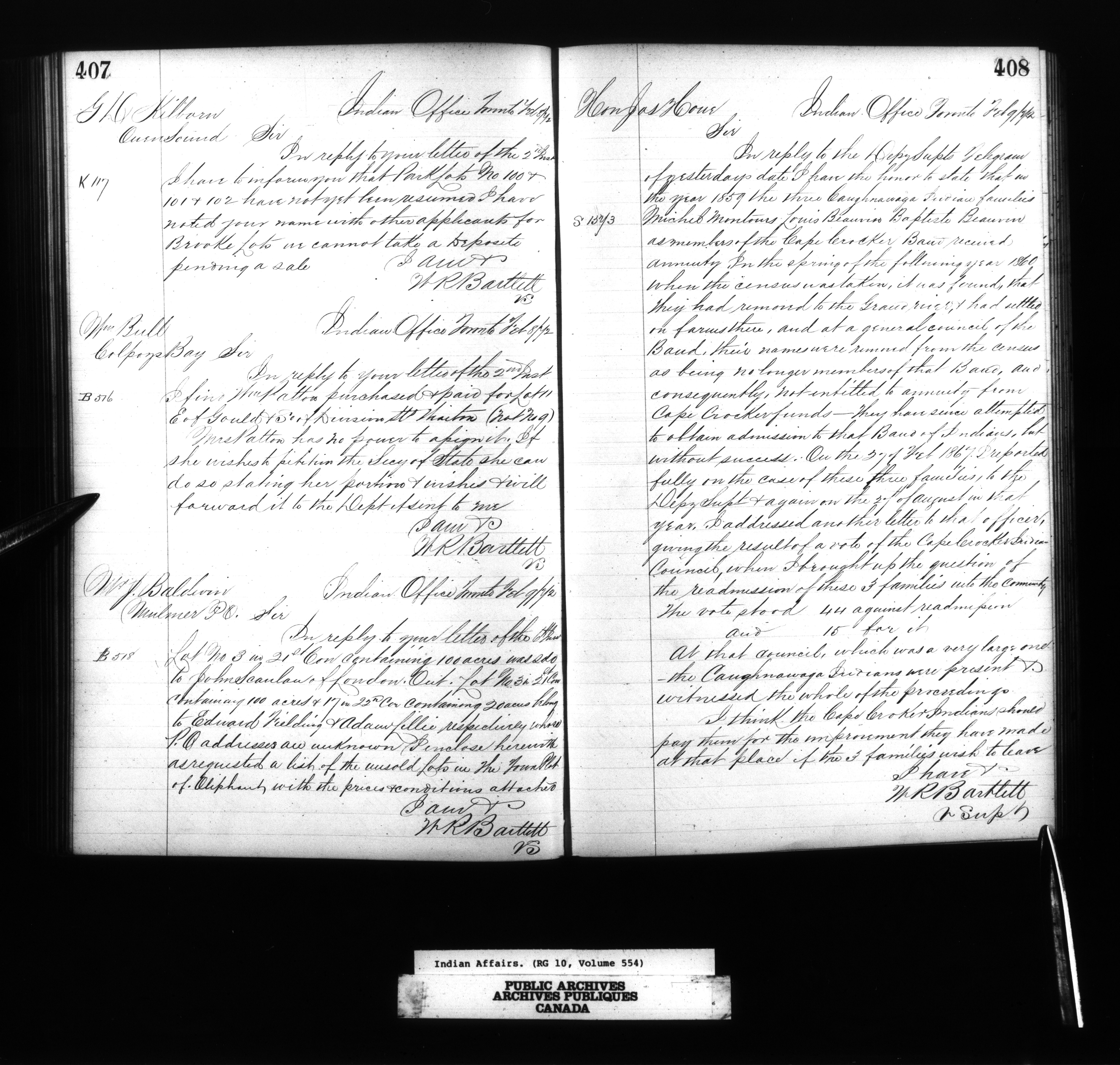 Department of Indian Affairs, Toronto office of the Central Superintendency : Superintendent William R. Bartlet's Indexed letterbooks - 13362