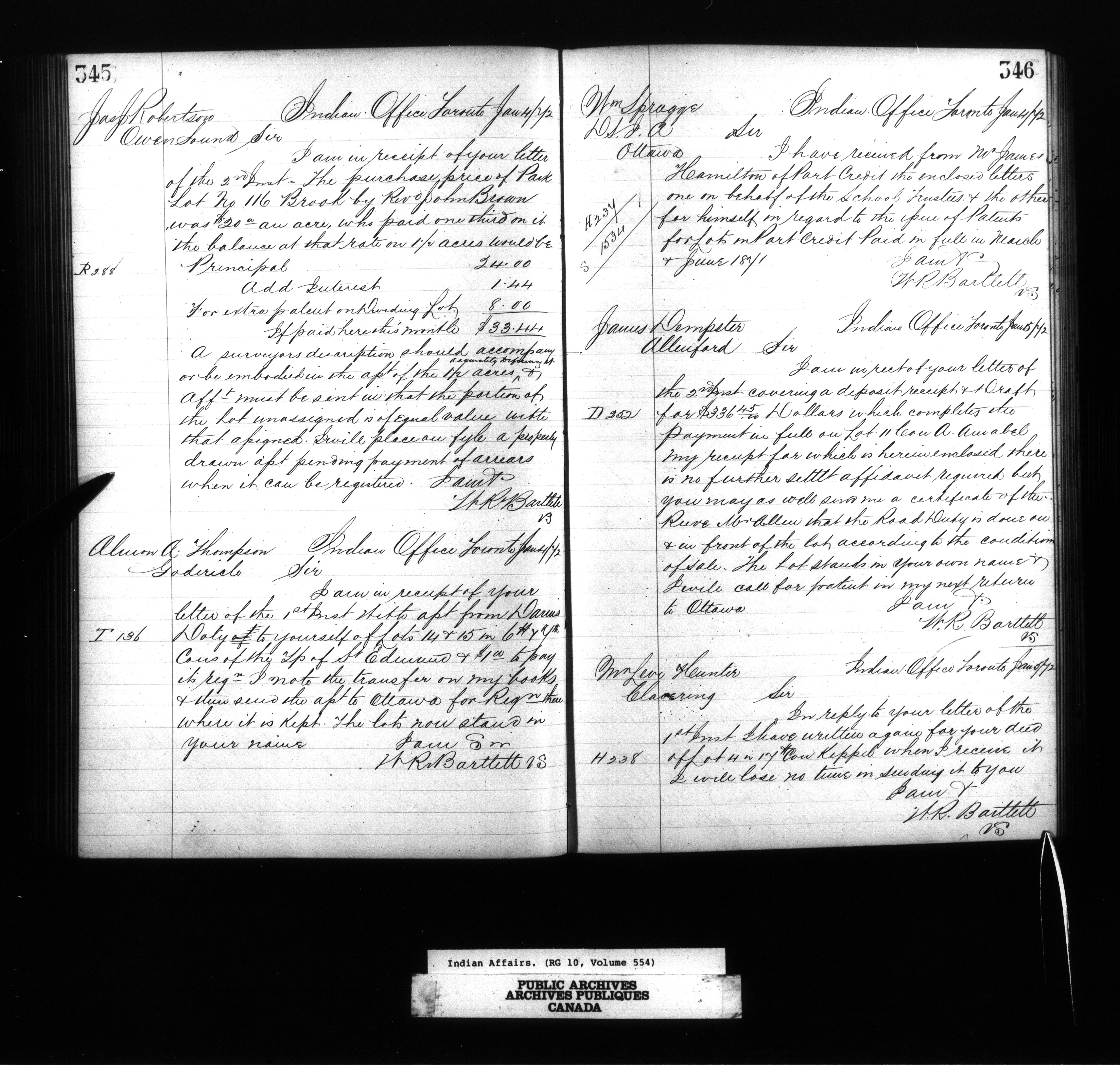 Department of Indian Affairs, Toronto office of the Central Superintendency : Superintendent William R. Bartlet's Indexed letterbooks - 13362