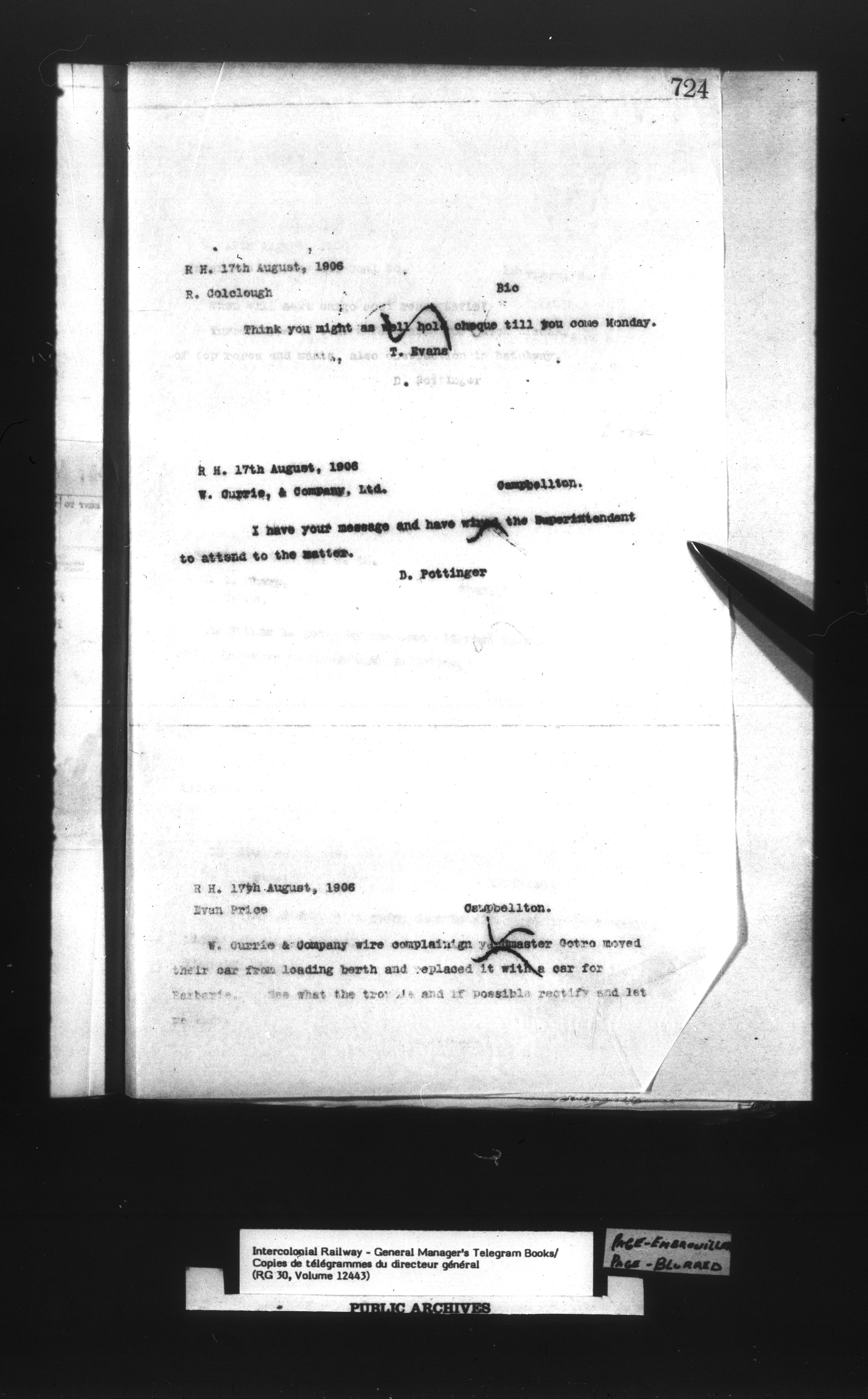 Canadian Government Railways : Office of the General Manager, Copies of telegrams - 13441
