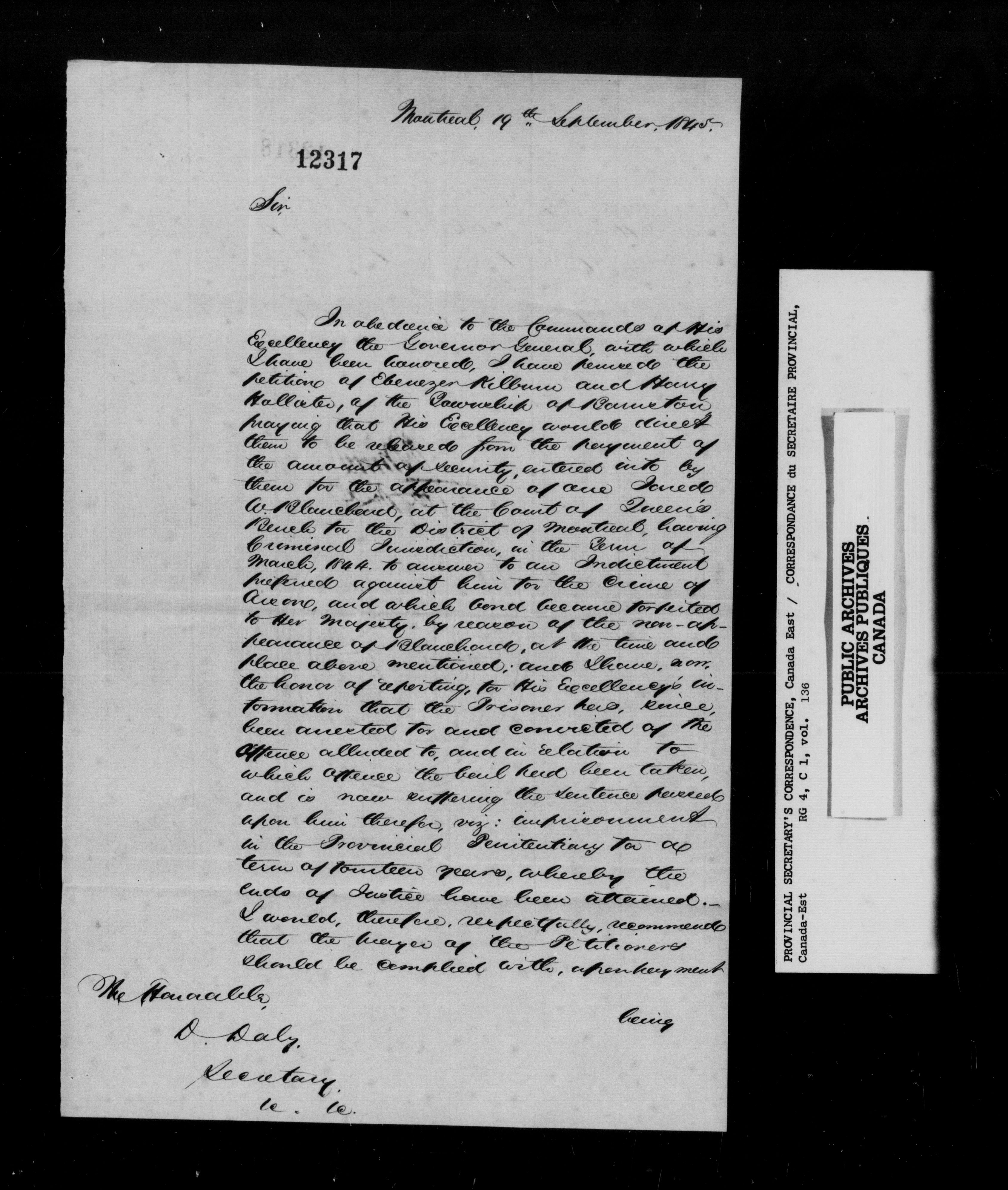 Provincial Secretary, Canada East : Numbered Correspondence Files, 1839-1867 - 13536