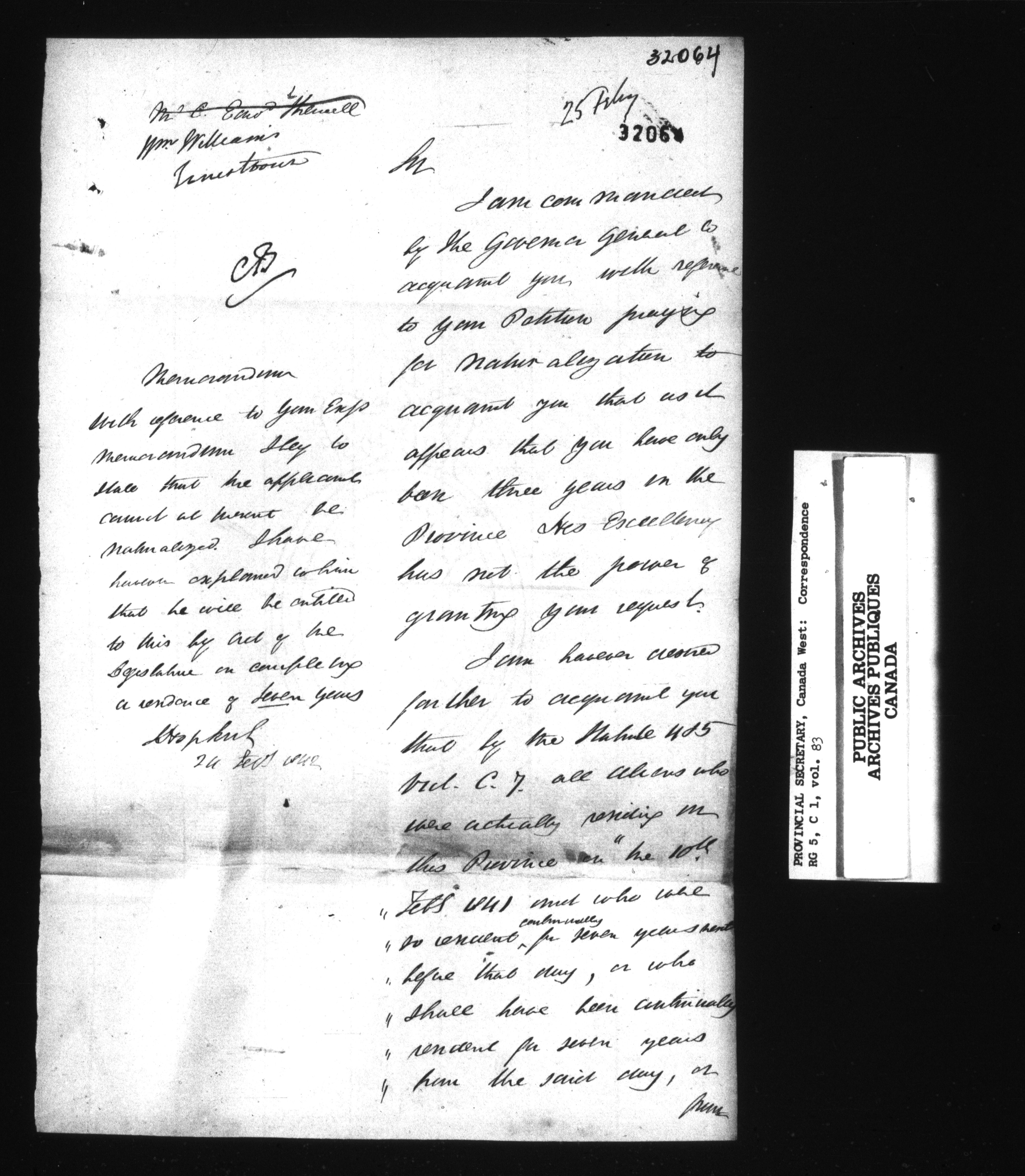 RG 5 C1, Provincial Secretary, Correspondence, Canada West - 13568