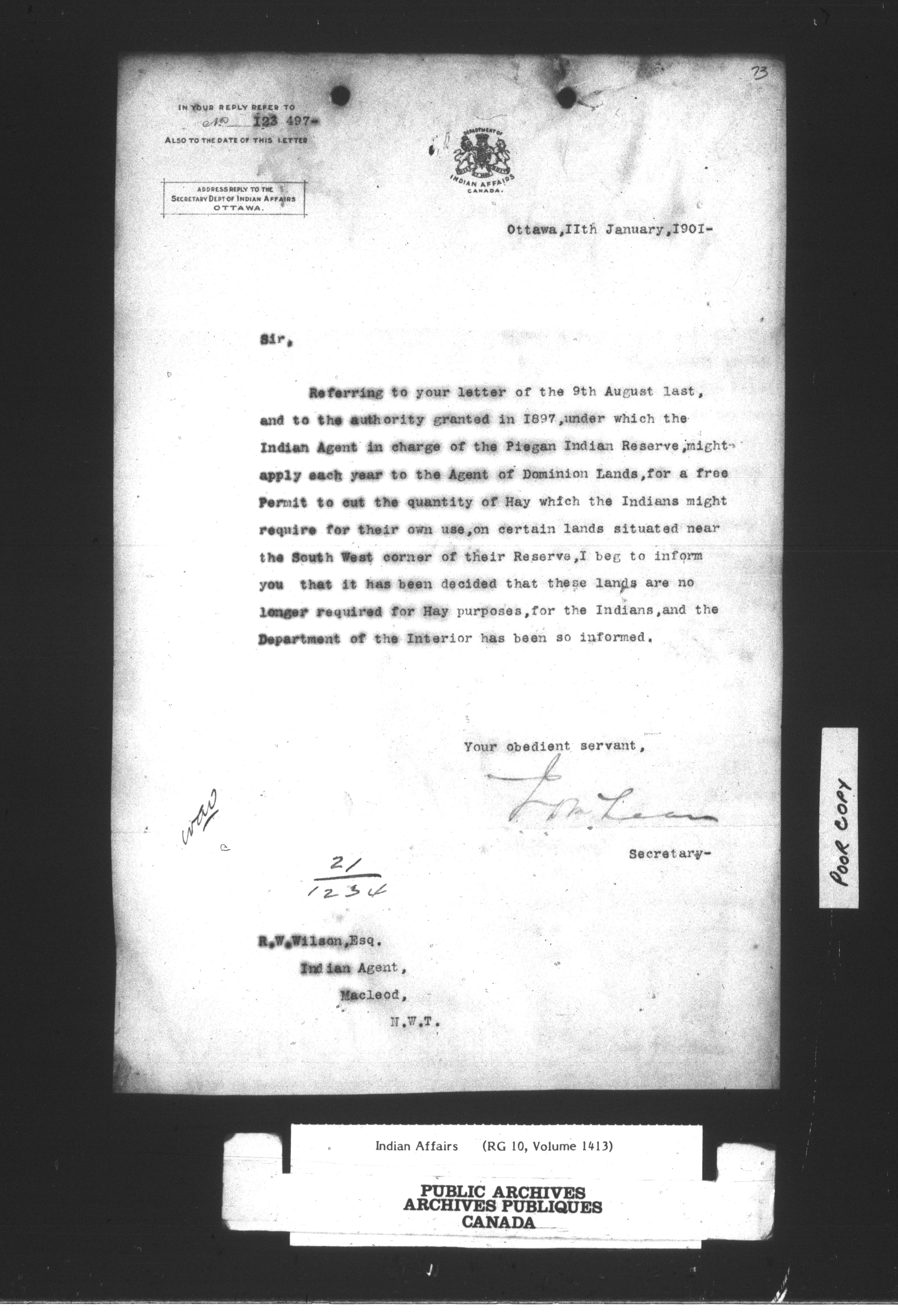 Department of Indian Affairs : Peigan Agency - 14255