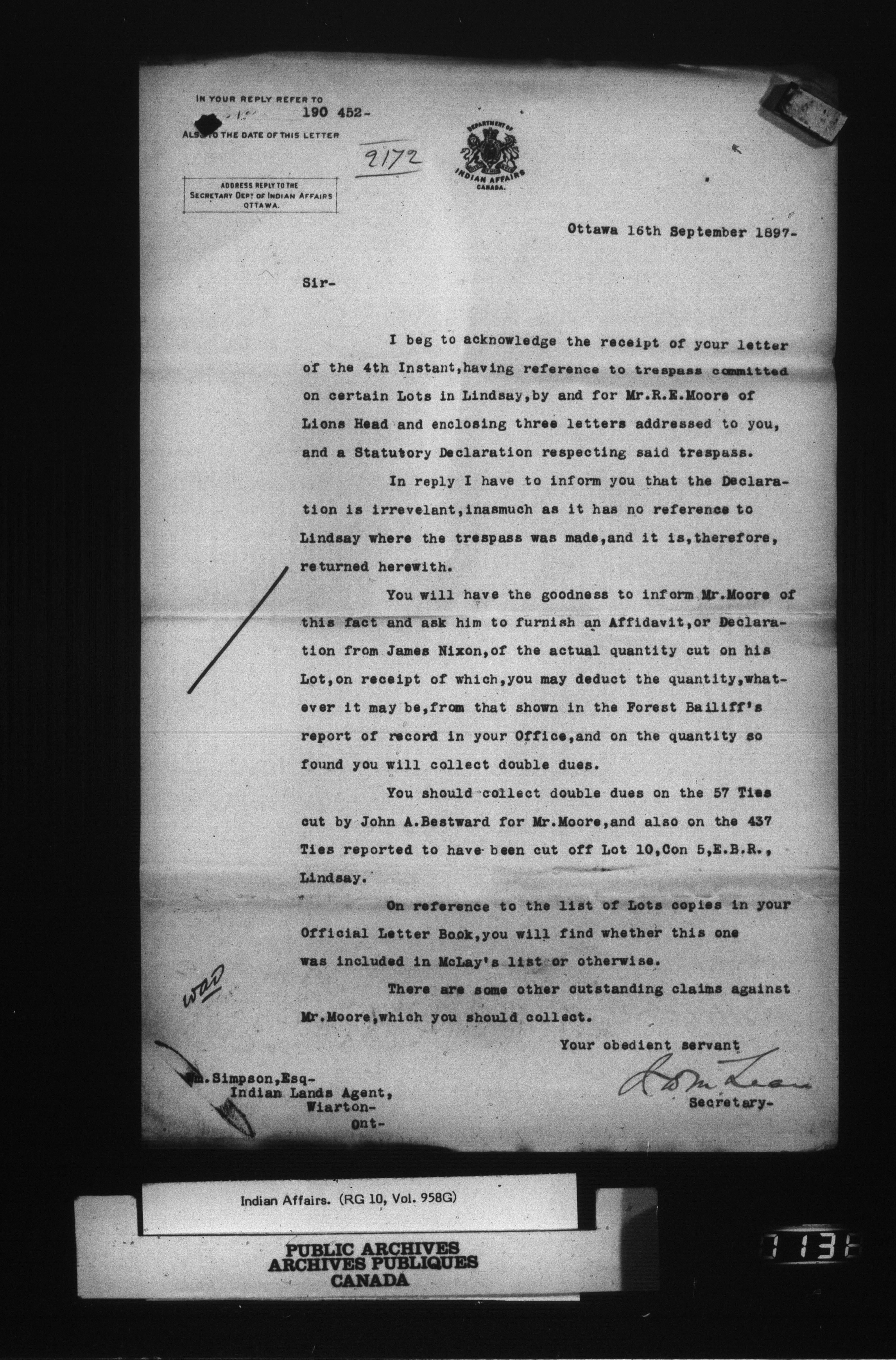 Indian Land Records Wiarton Land Office correspondence - 14831