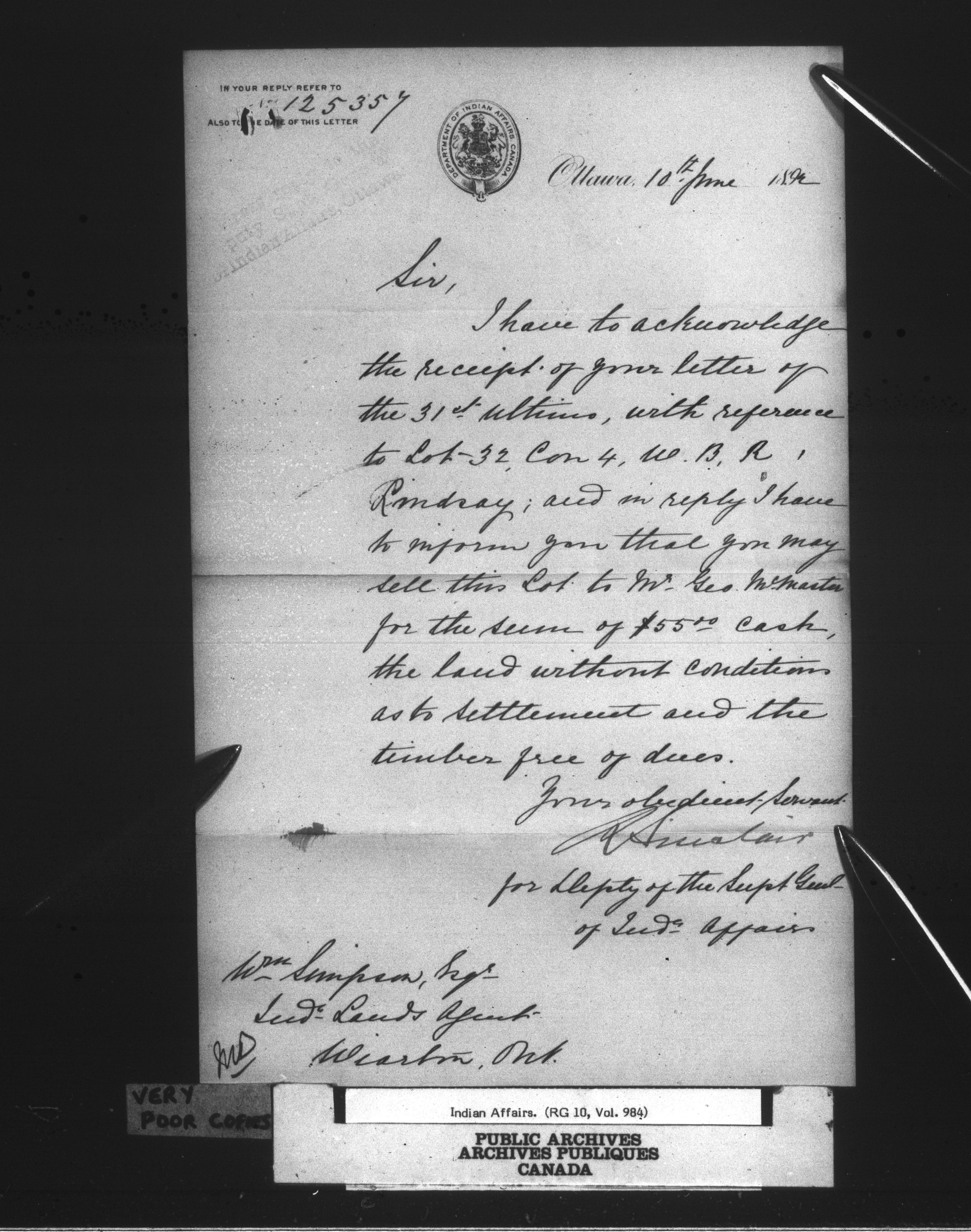 Indian Land Records Wiarton Land Office correspondence - 14836