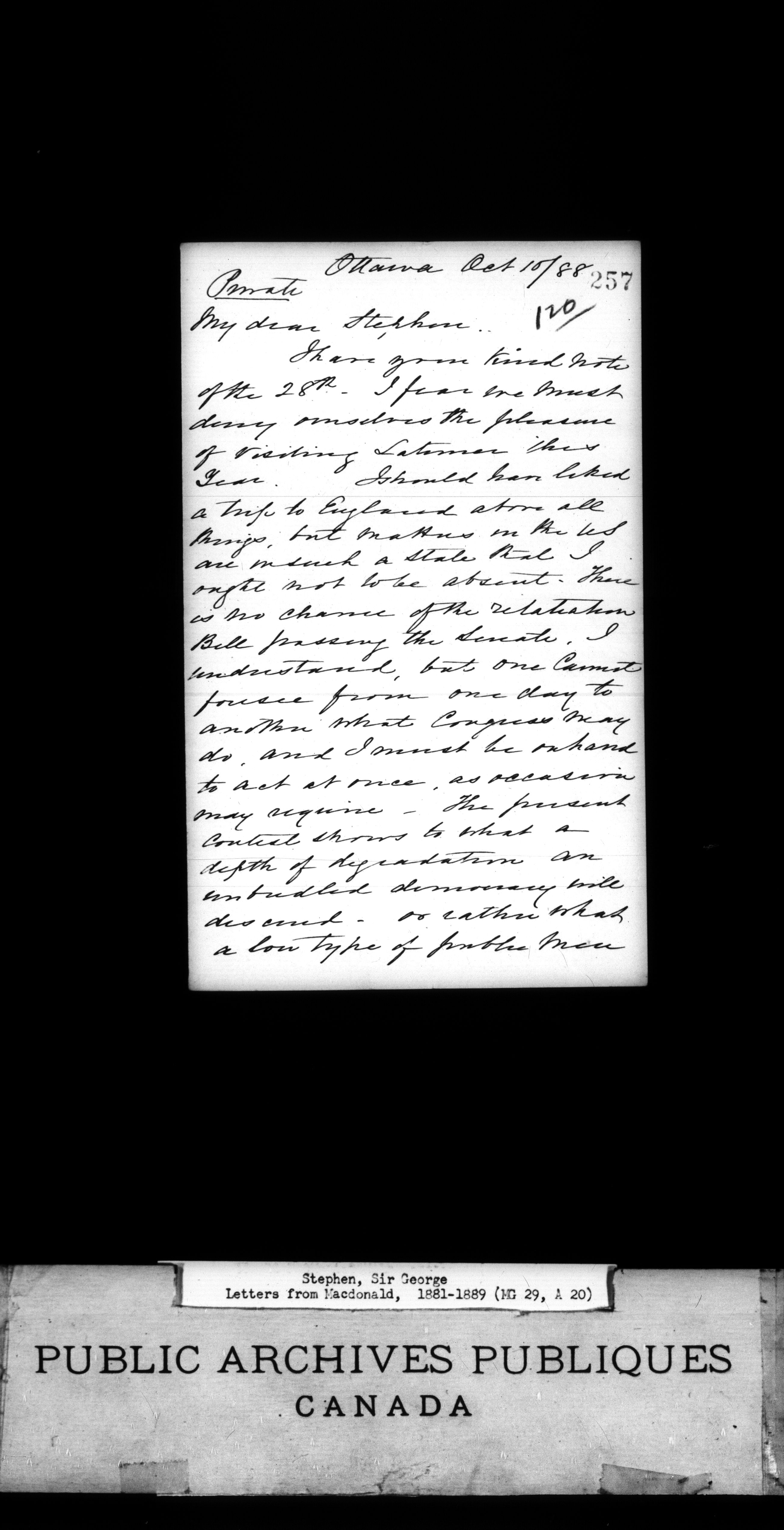 Stephen, Sir George - microfilm copy of 135 letters from Macdonald, 1881-1889 - 1486