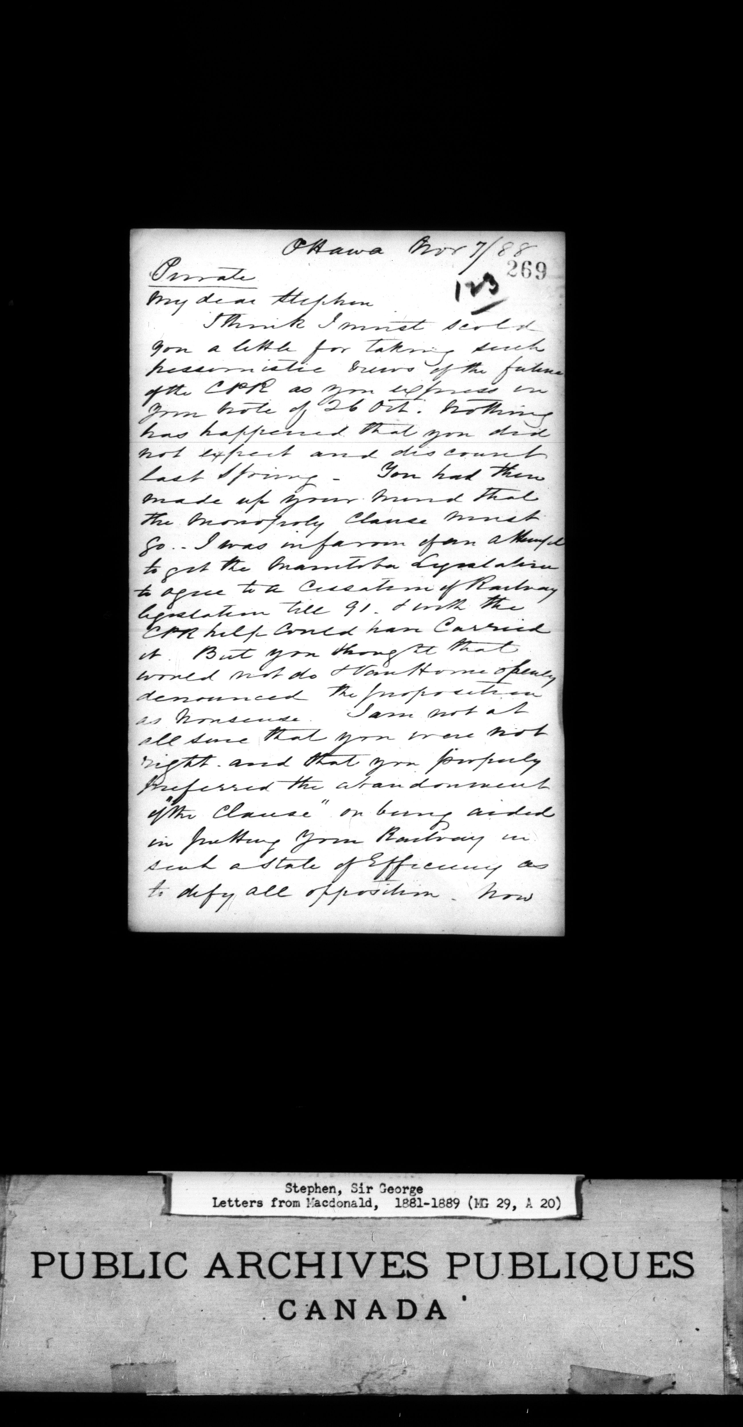 Stephen, Sir George - microfilm copy of 135 letters from Macdonald, 1881-1889 - 1486