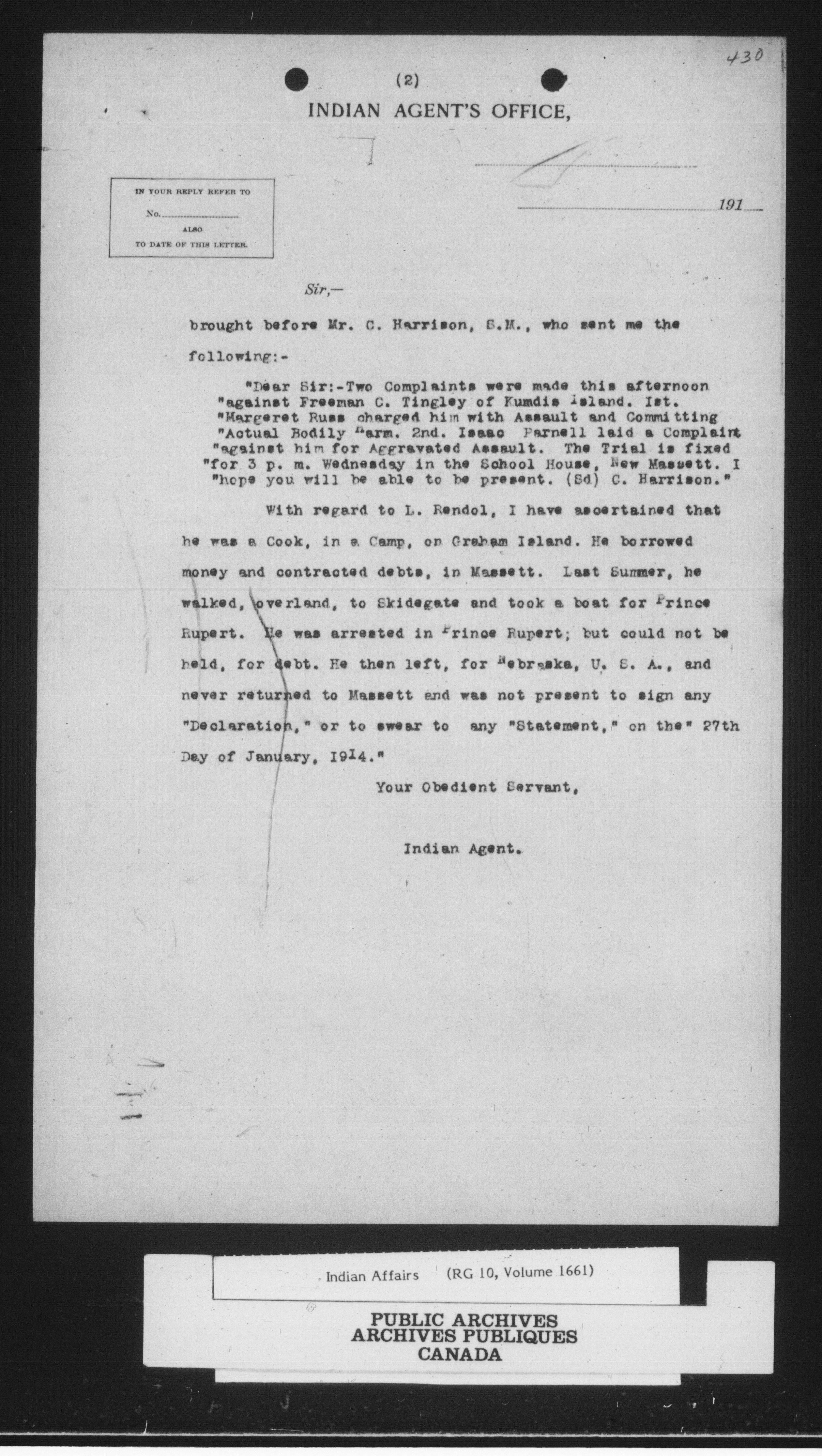 Department of Indian Affairs : Assiniboine Agency - 14880