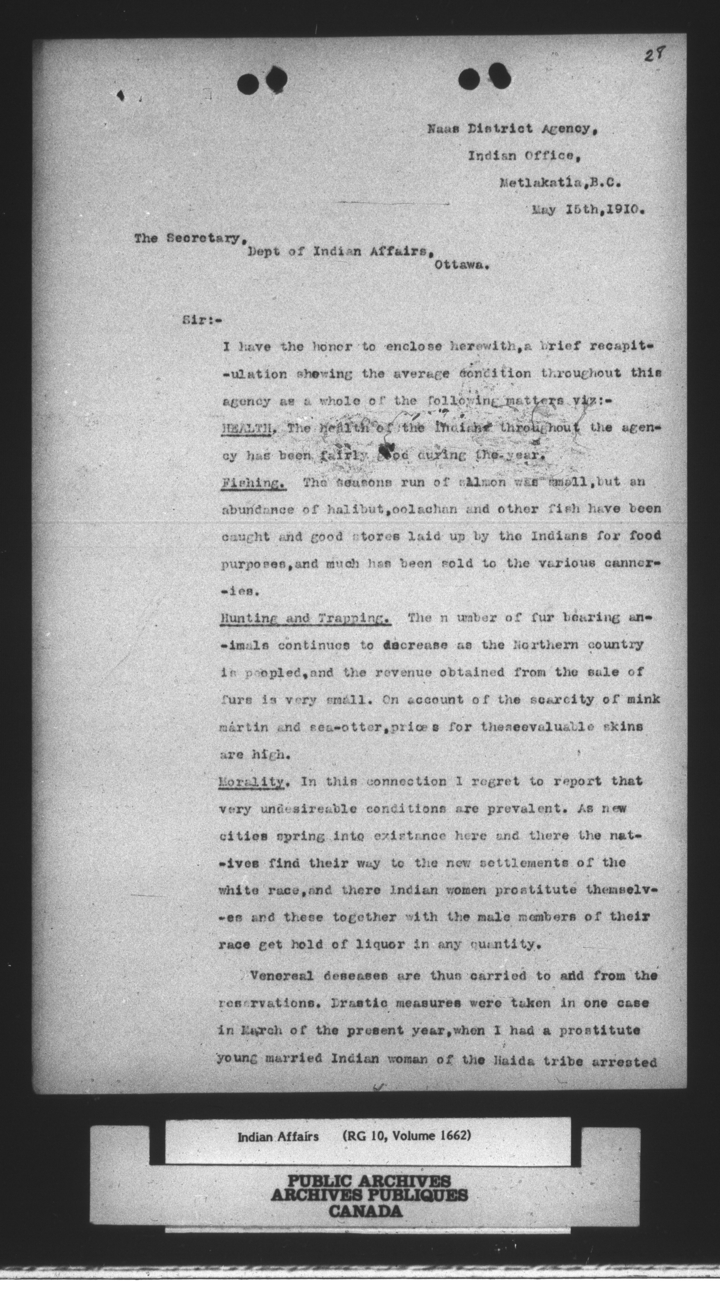 Contents: Nass Agency : Correspondence and Agent's Reports, A (1910-1915)-B (1904-1920) - Volume 1662, images 13-630