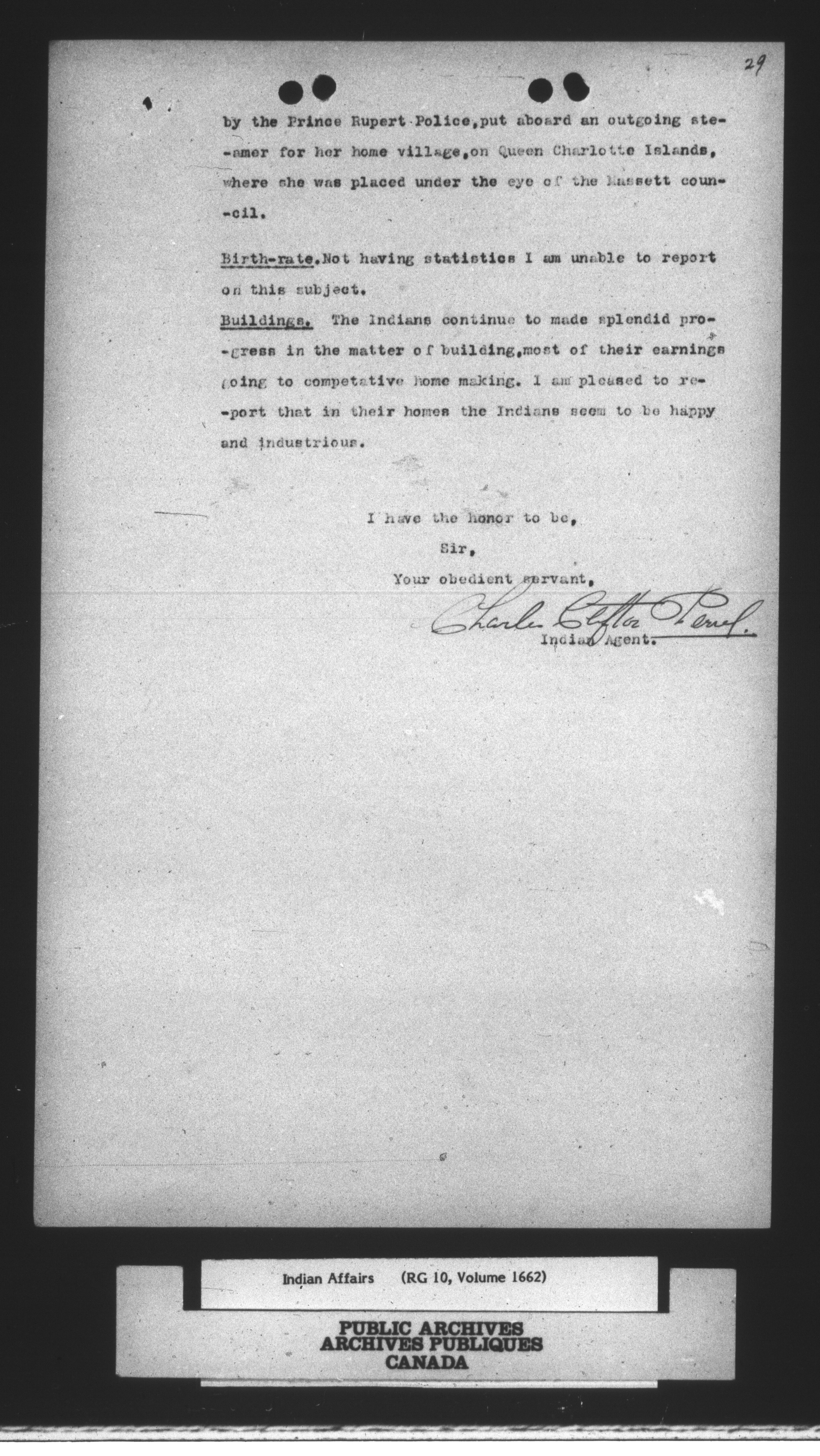 Contents: Nass Agency : Correspondence and Agent's Reports, A (1910-1915)-B (1904-1920) - Volume 1662, images 13-630