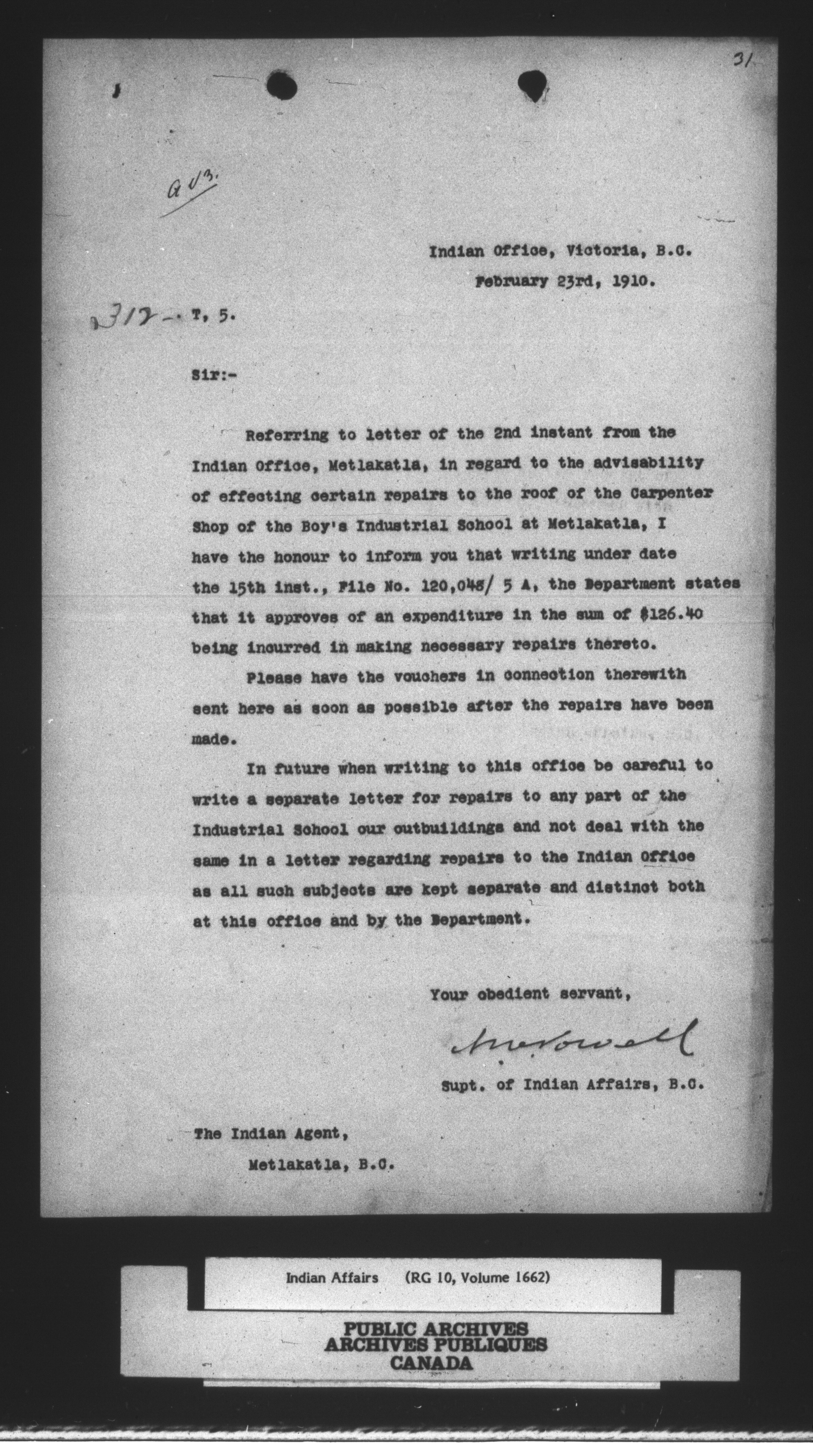 Contents: Nass Agency : Correspondence and Agent's Reports, A (1910-1915)-B (1904-1920) - Volume 1662, images 13-630