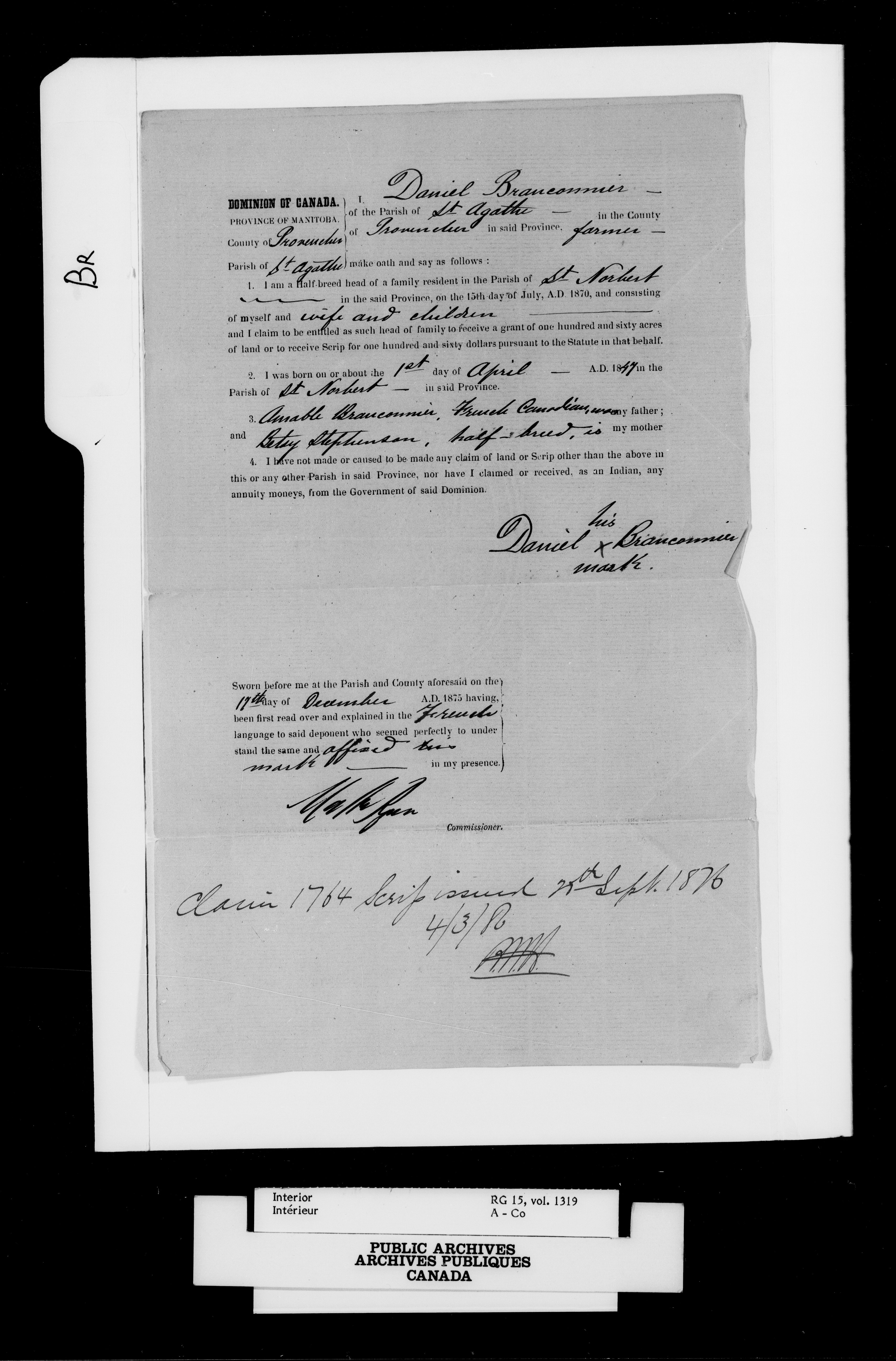 Department of the Interior, Dominion Lands Branch : Métis and original White settlers affidavits - 14926