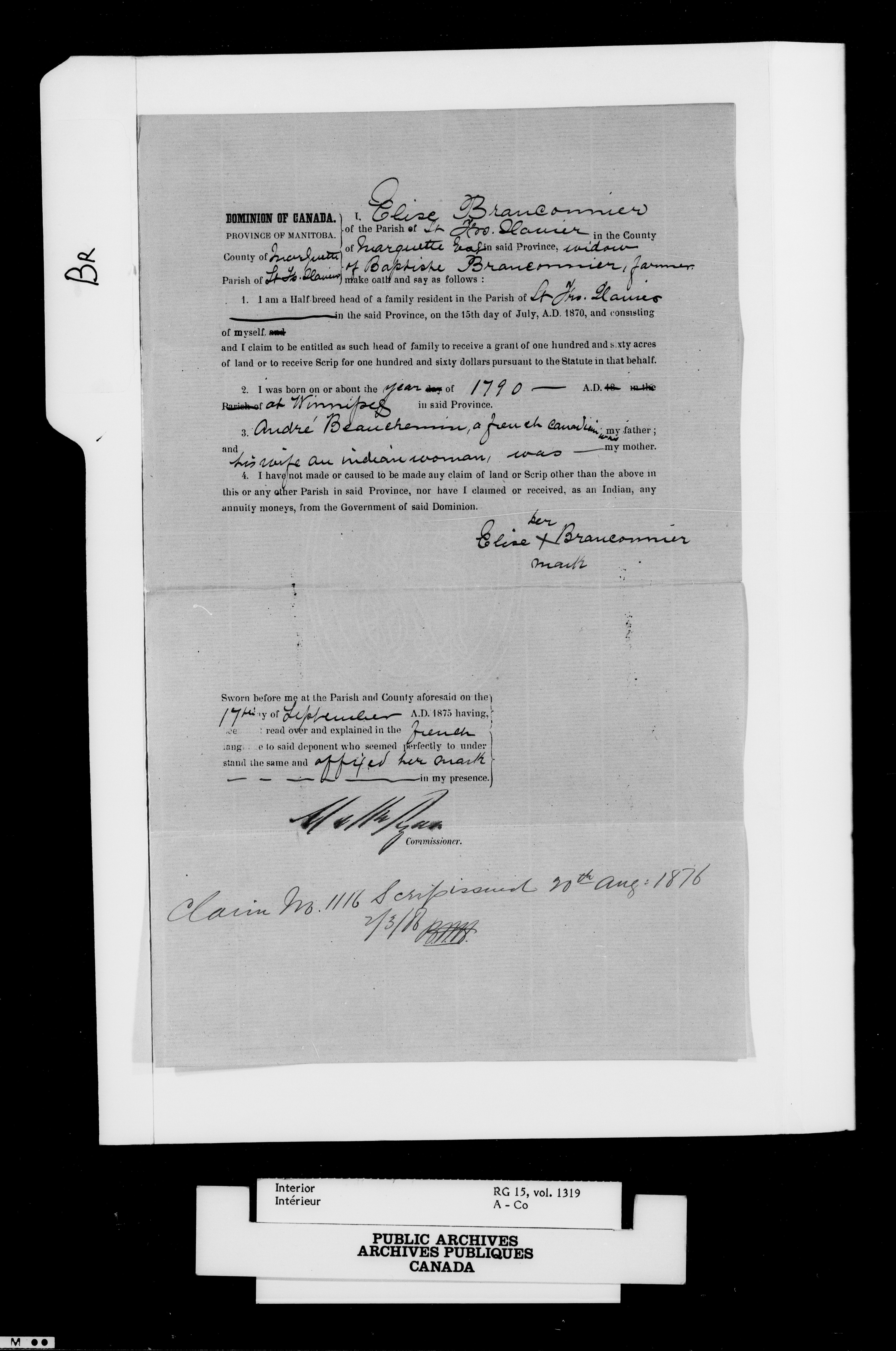 Department of the Interior, Dominion Lands Branch : Métis and original White settlers affidavits - 14926