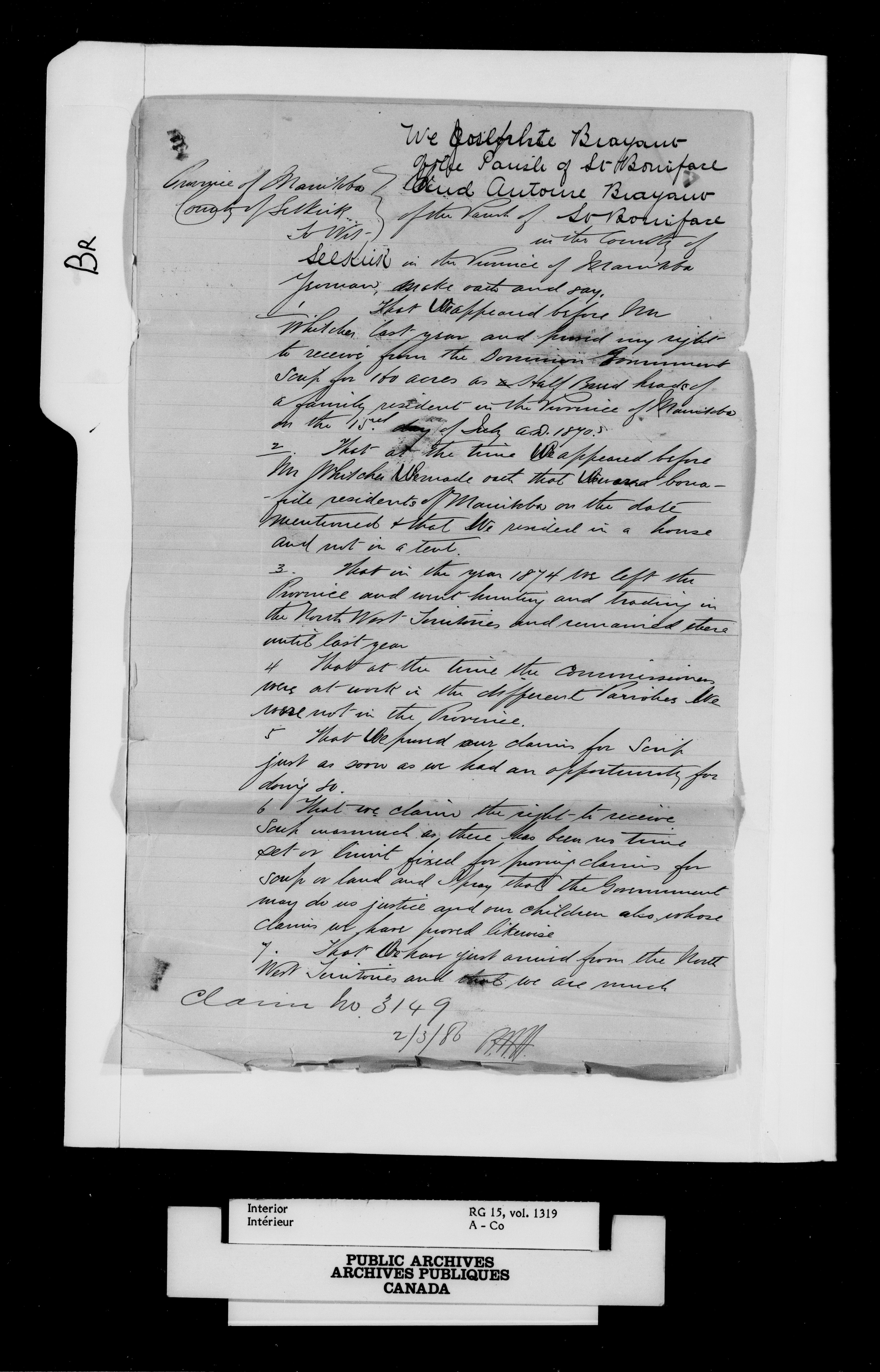 Department of the Interior, Dominion Lands Branch : Métis and original White settlers affidavits - 14926