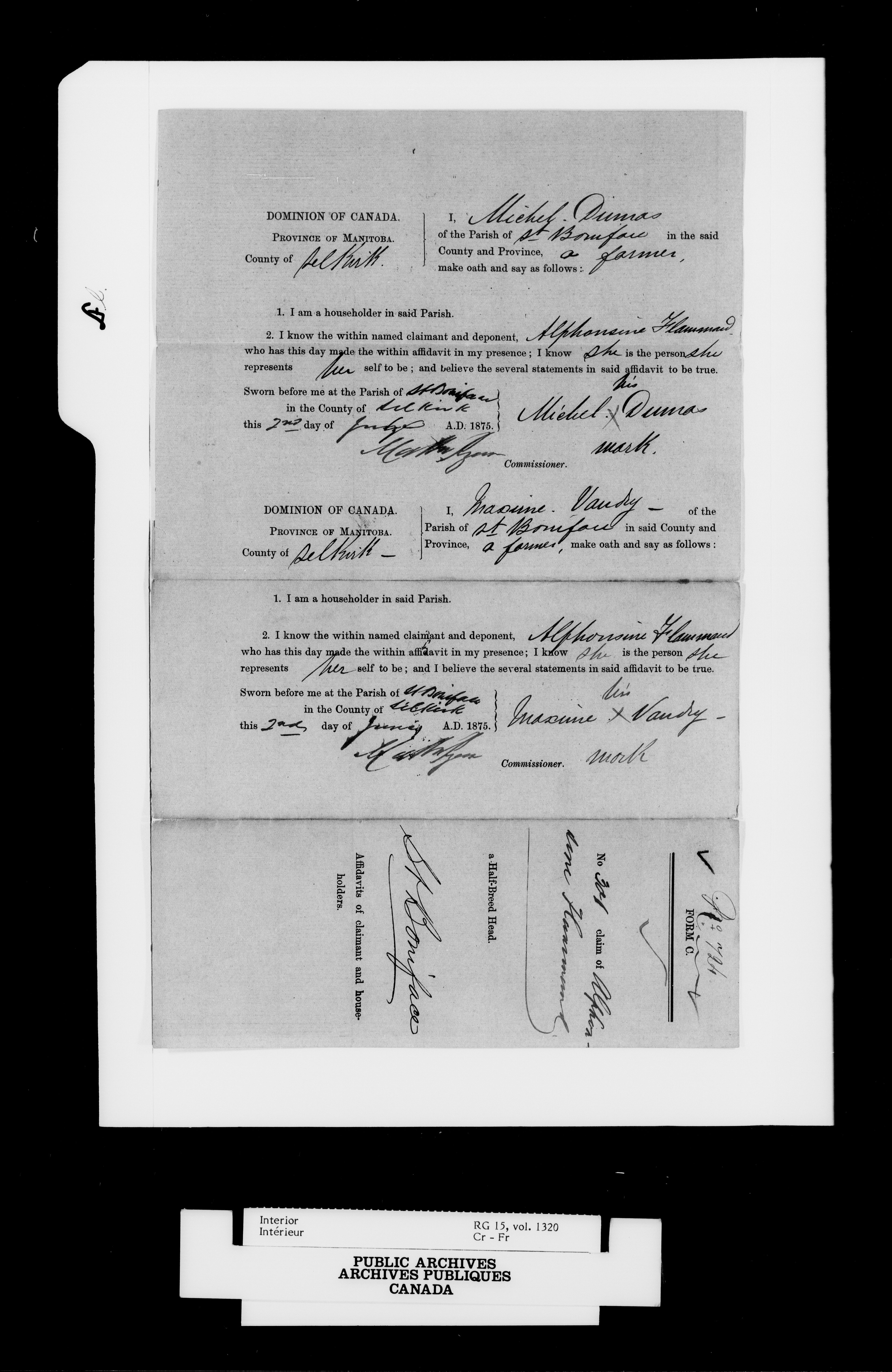 Department of the Interior, Dominion Lands Branch : Métis and original White settlers affidavits : C-14927