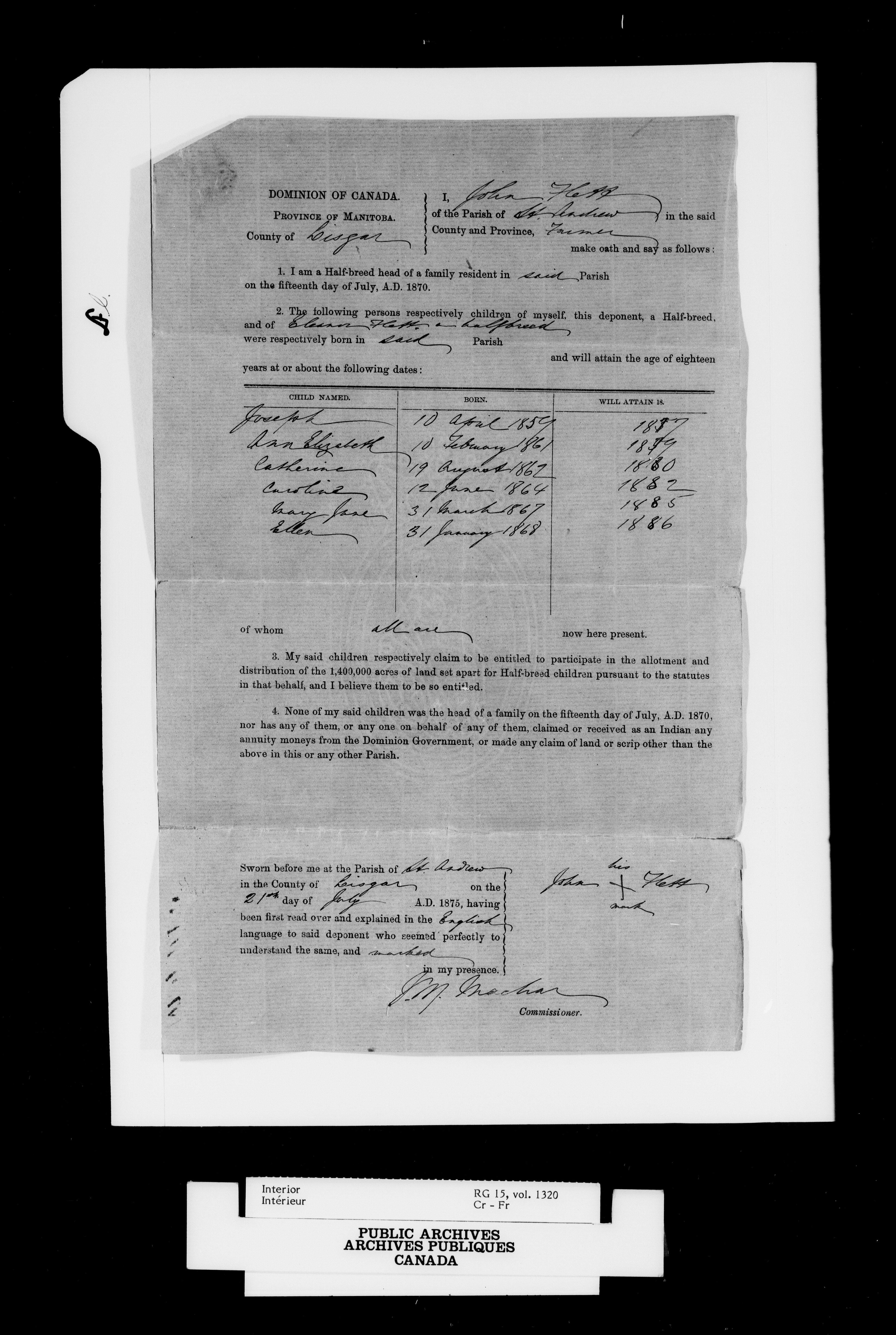 Department of the Interior, Dominion Lands Branch : Métis and original White settlers affidavits - 14928