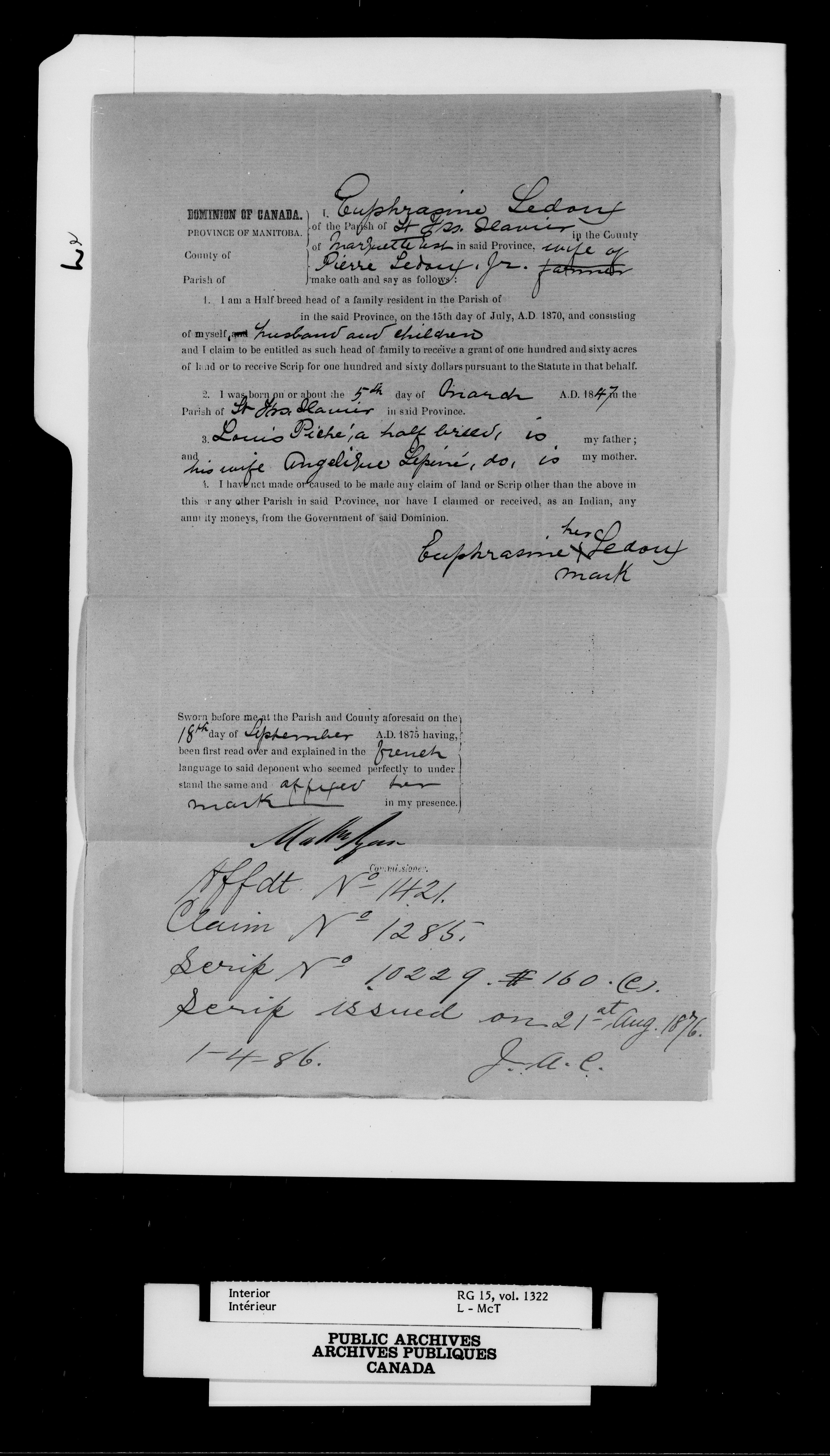Department of the Interior, Dominion Lands Branch : Métis and original White settlers affidavits : C-14930