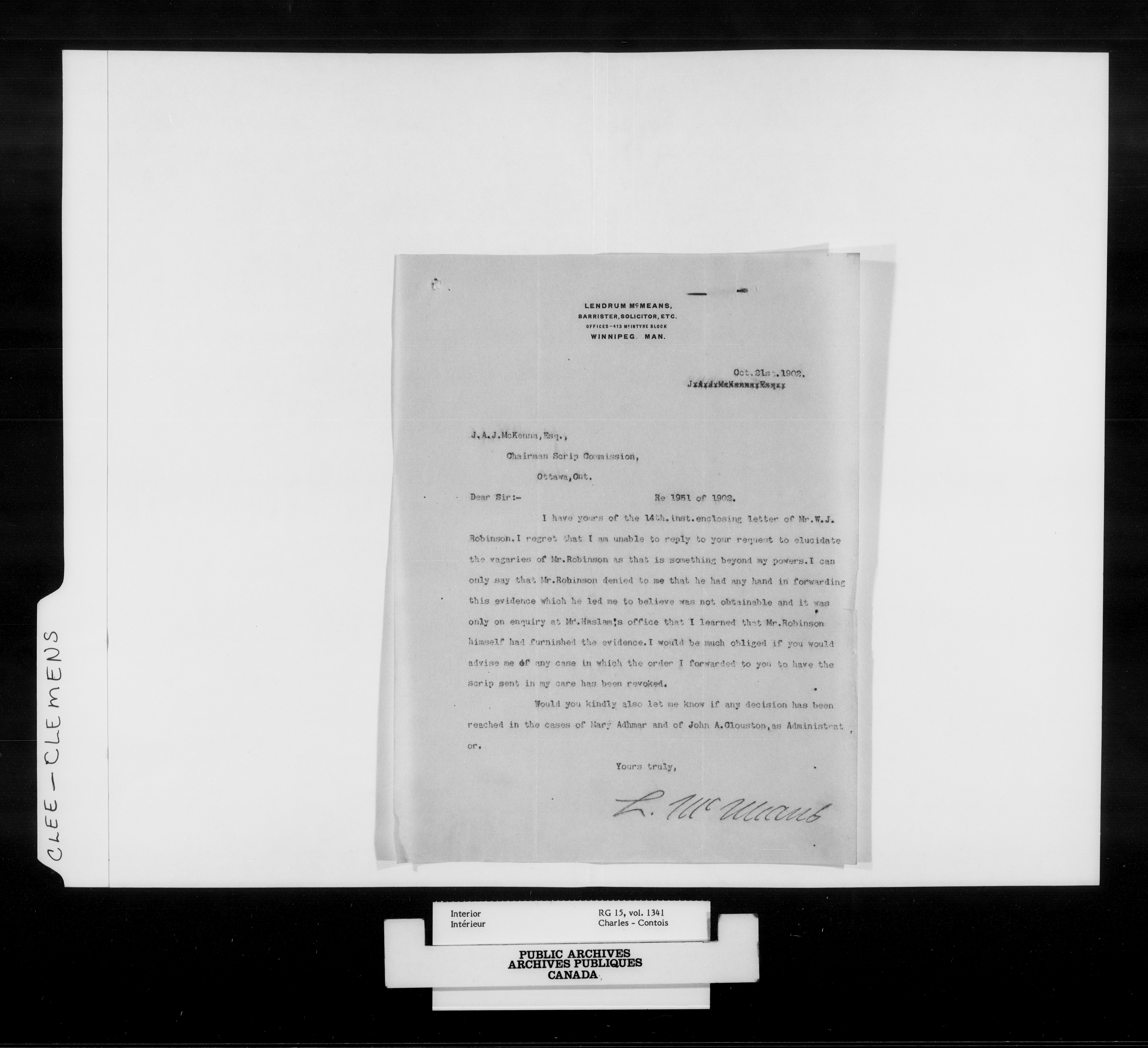 Department of the Interior, Dominion Lands Branch : North-West Territories Métis scrip applications : C-14958