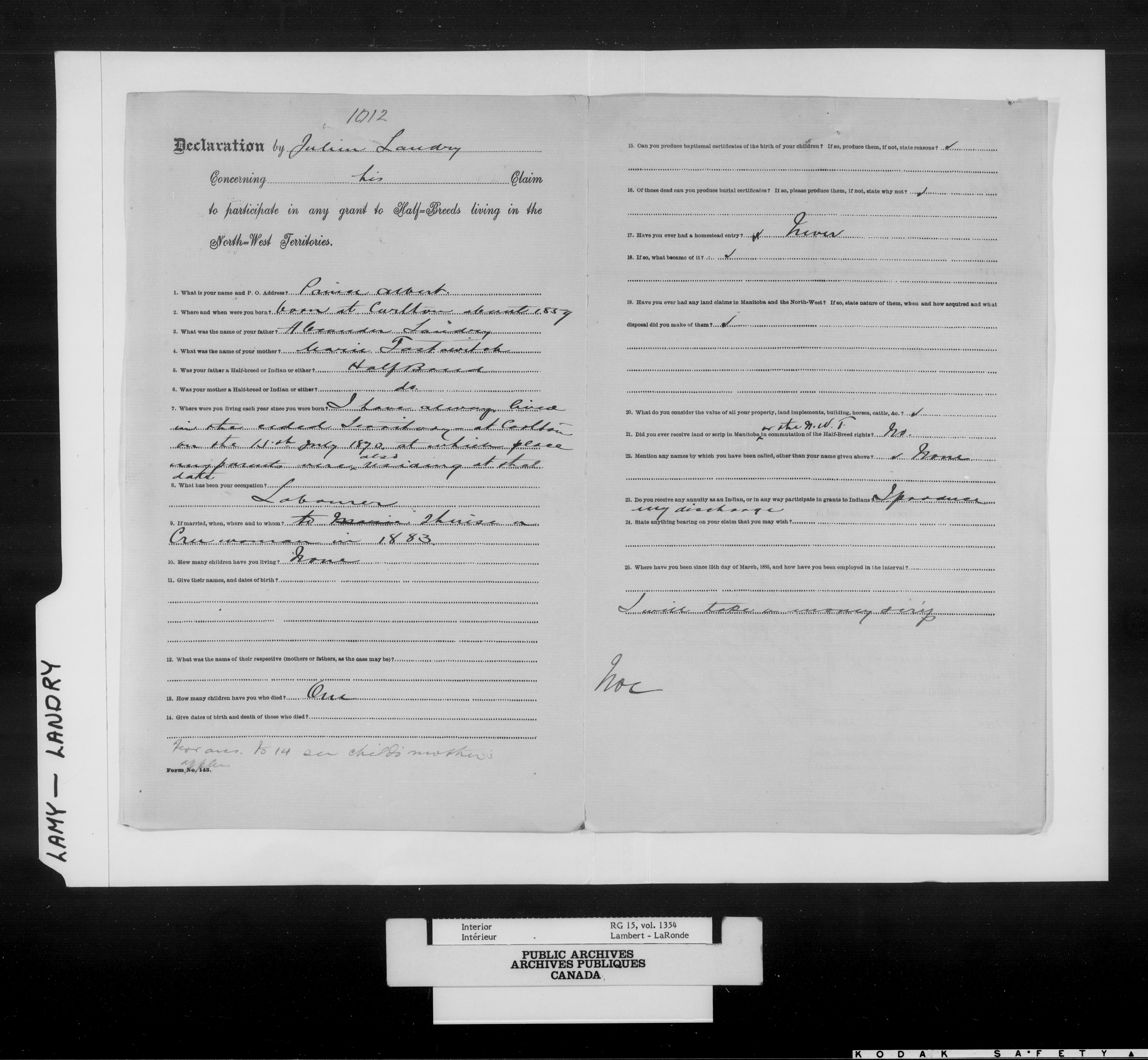 Department of the Interior, Dominion Lands Branch : North-West Territories Métis scrip applications - 14981