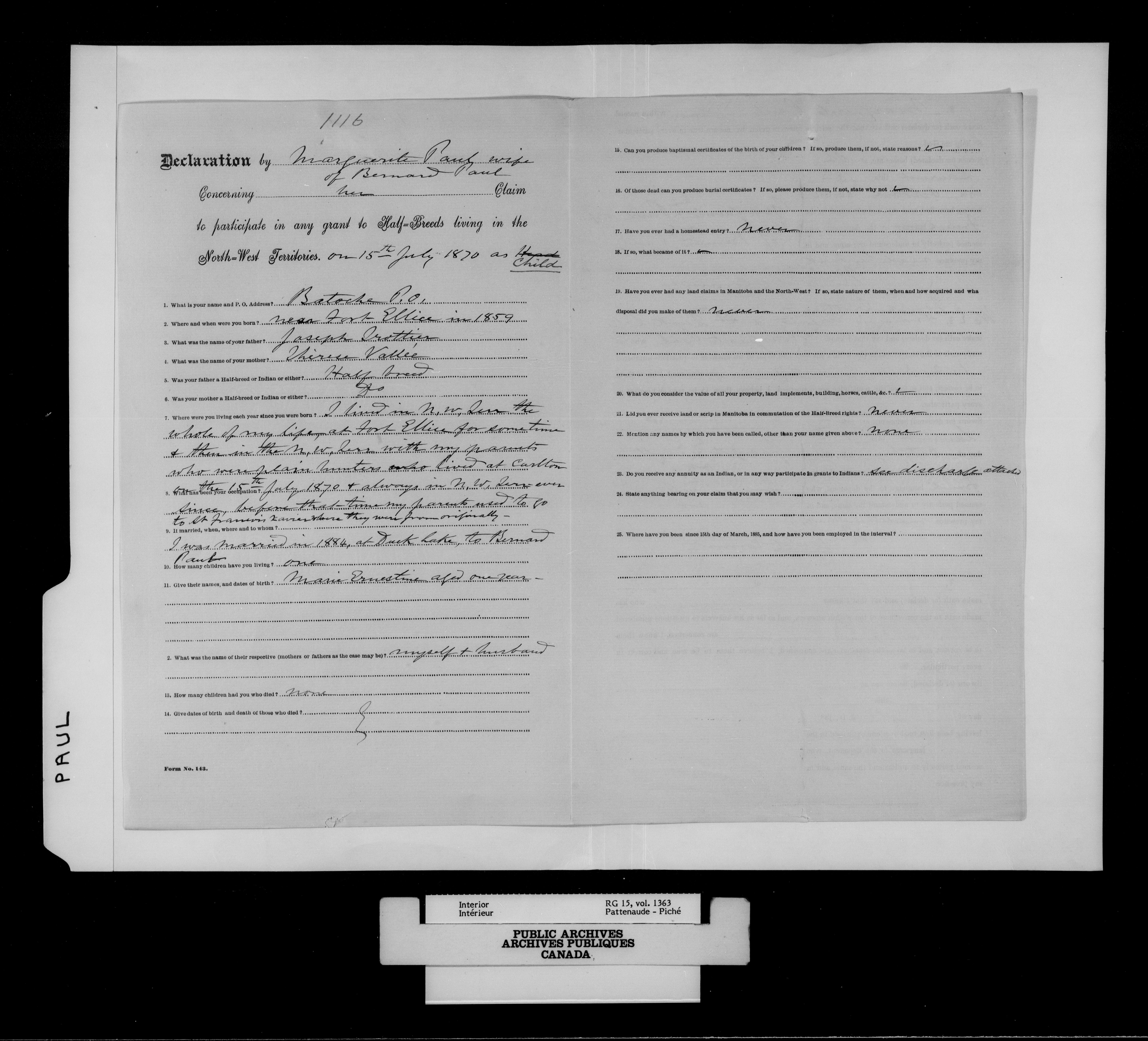 Department of the Interior, Dominion Lands Branch : North-West Territories Métis scrip applications - 14996