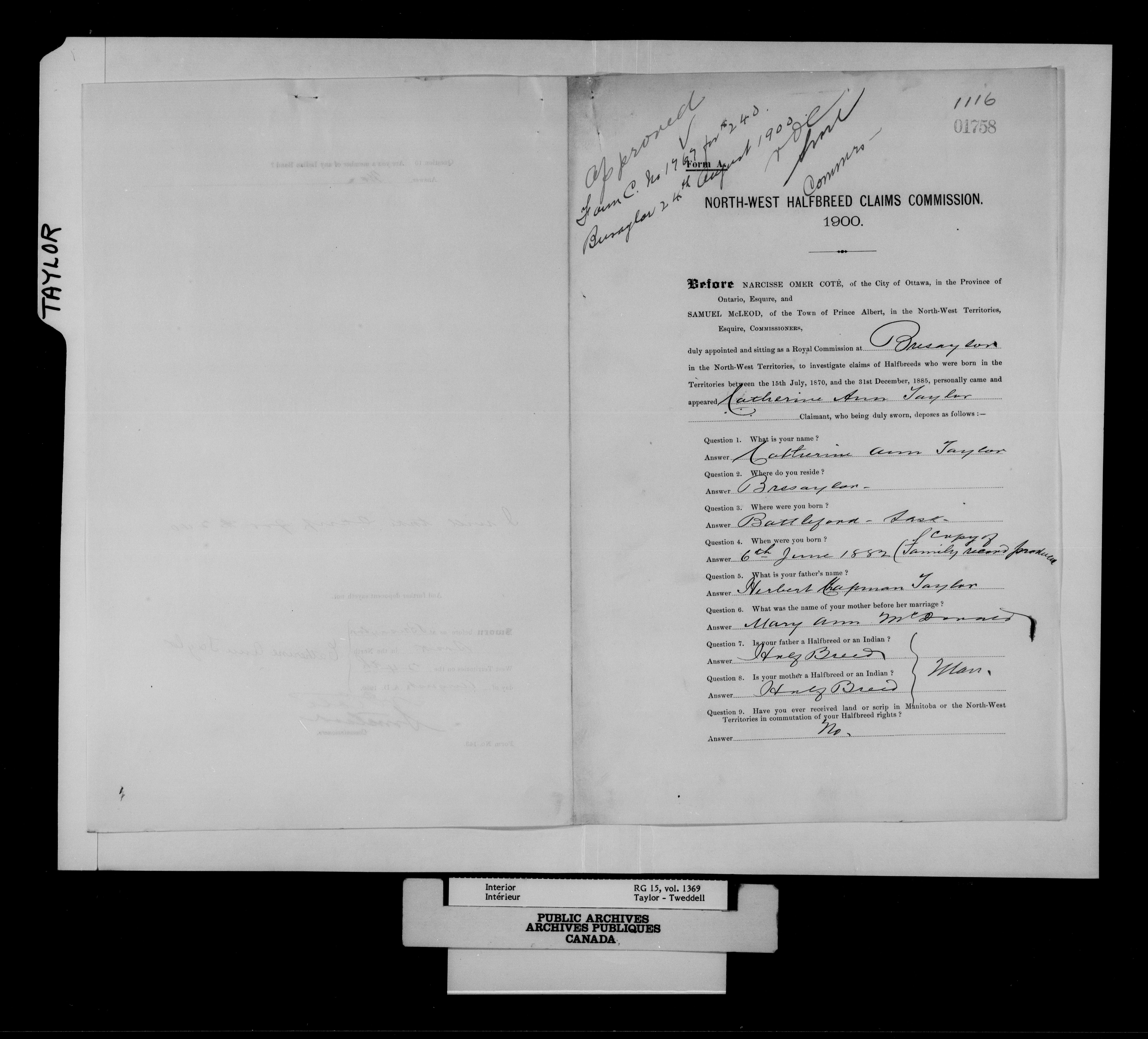 Department of the Interior, Dominion Lands Branch : North-West Territories Métis scrip applications : C-15005