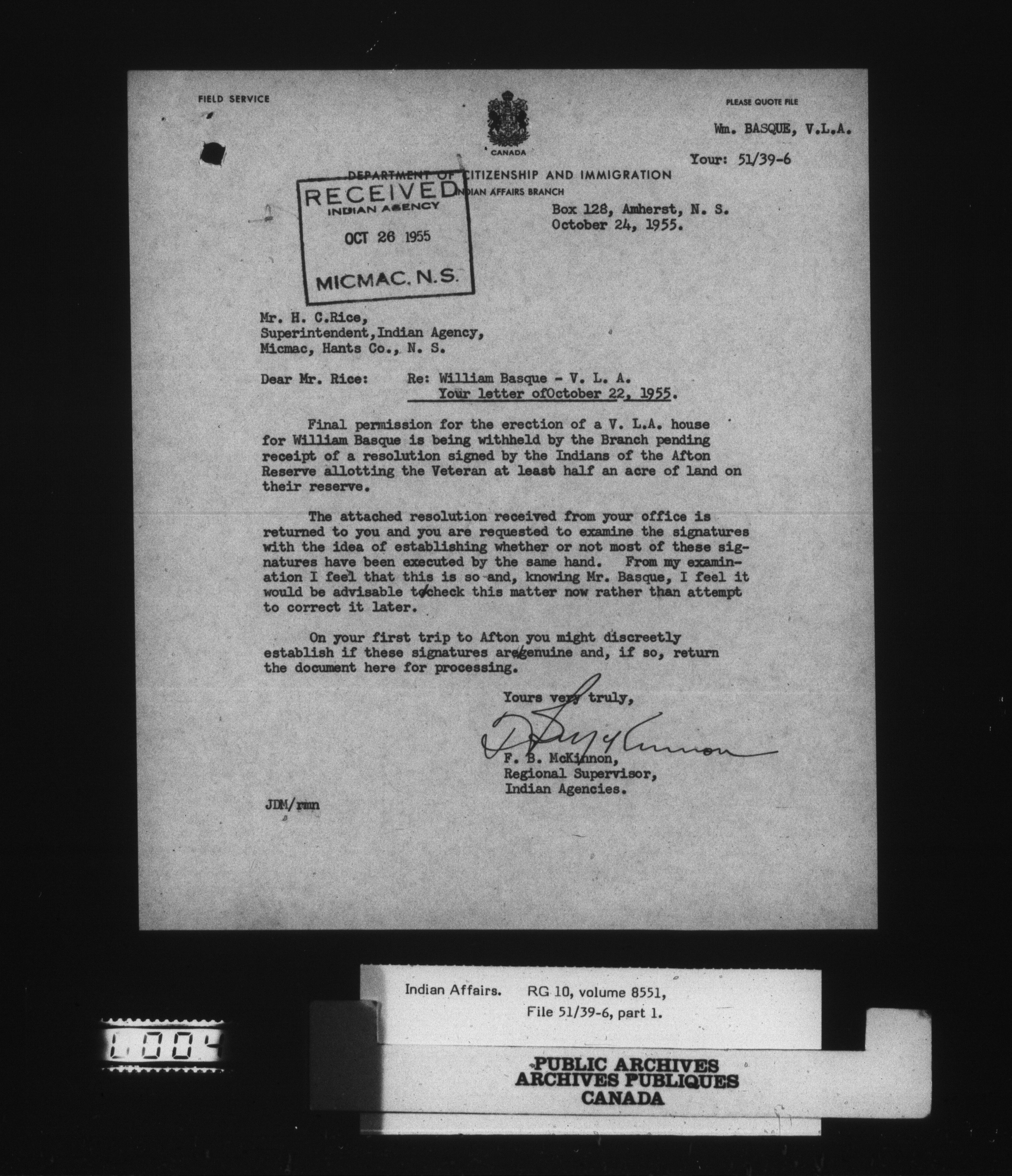 Shubenacadie Agency - Veterans Land Act - William Basque