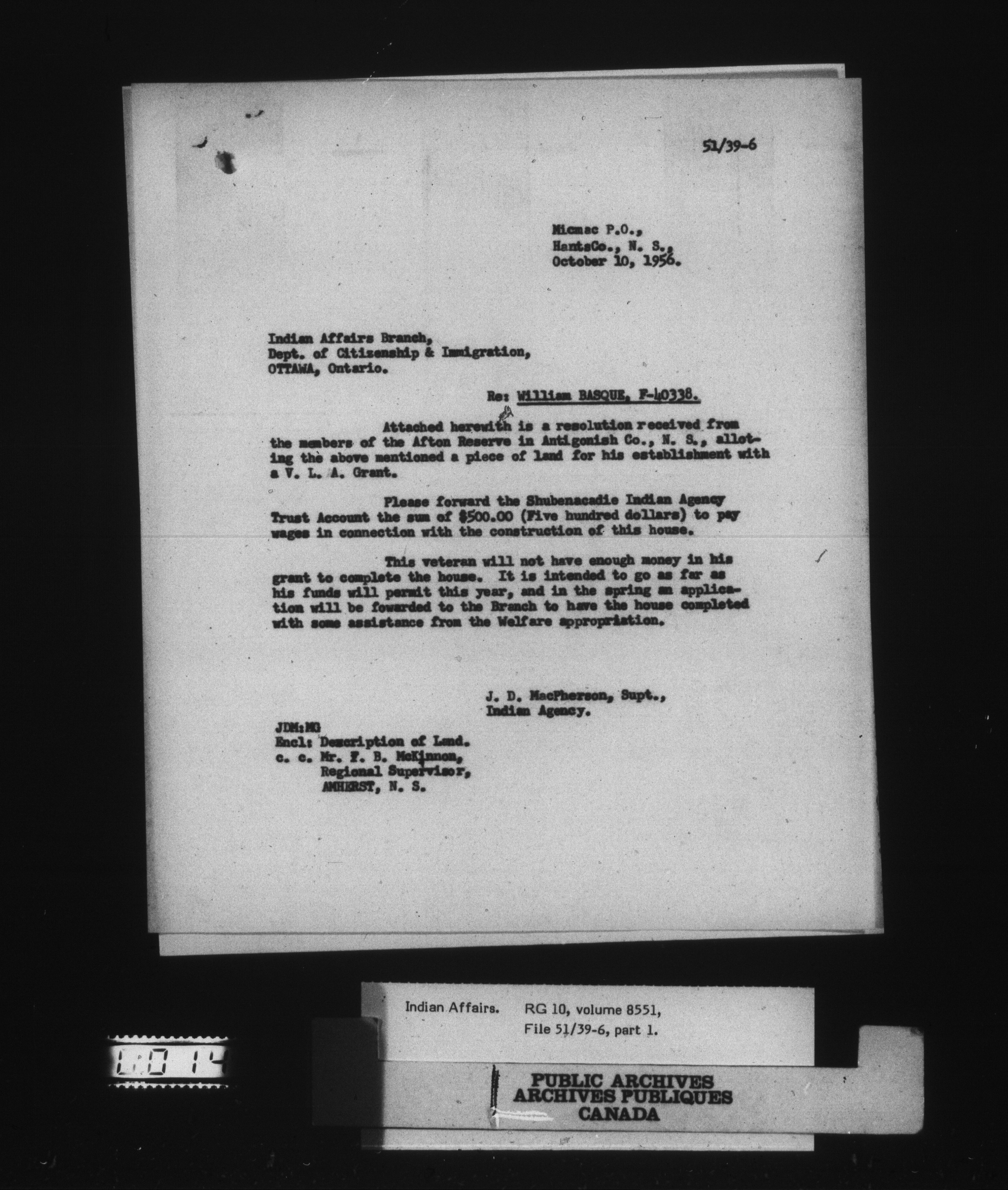 Shubenacadie Agency - Veterans Land Act - William Basque