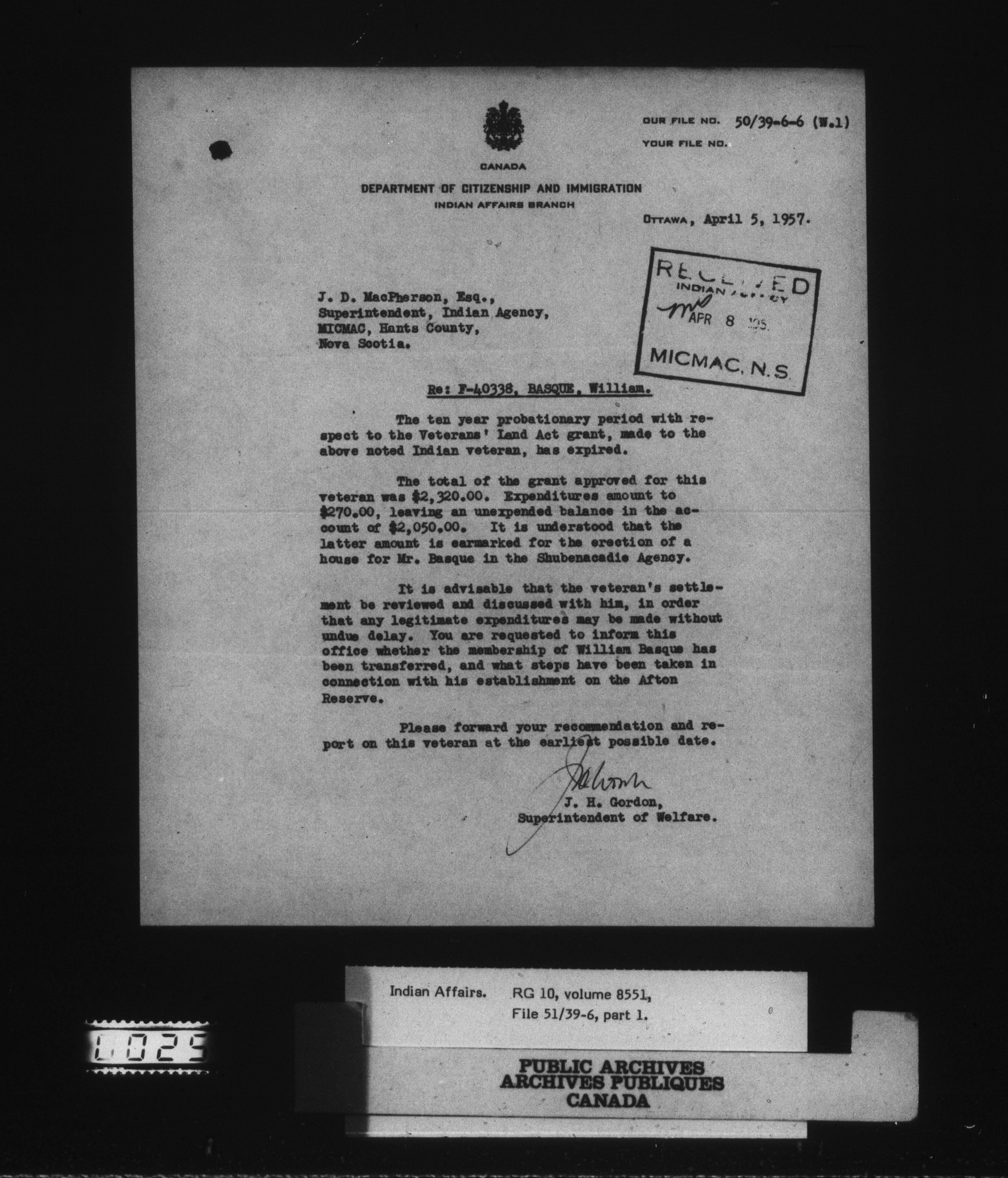 Shubenacadie Agency - Veterans Land Act - William Basque