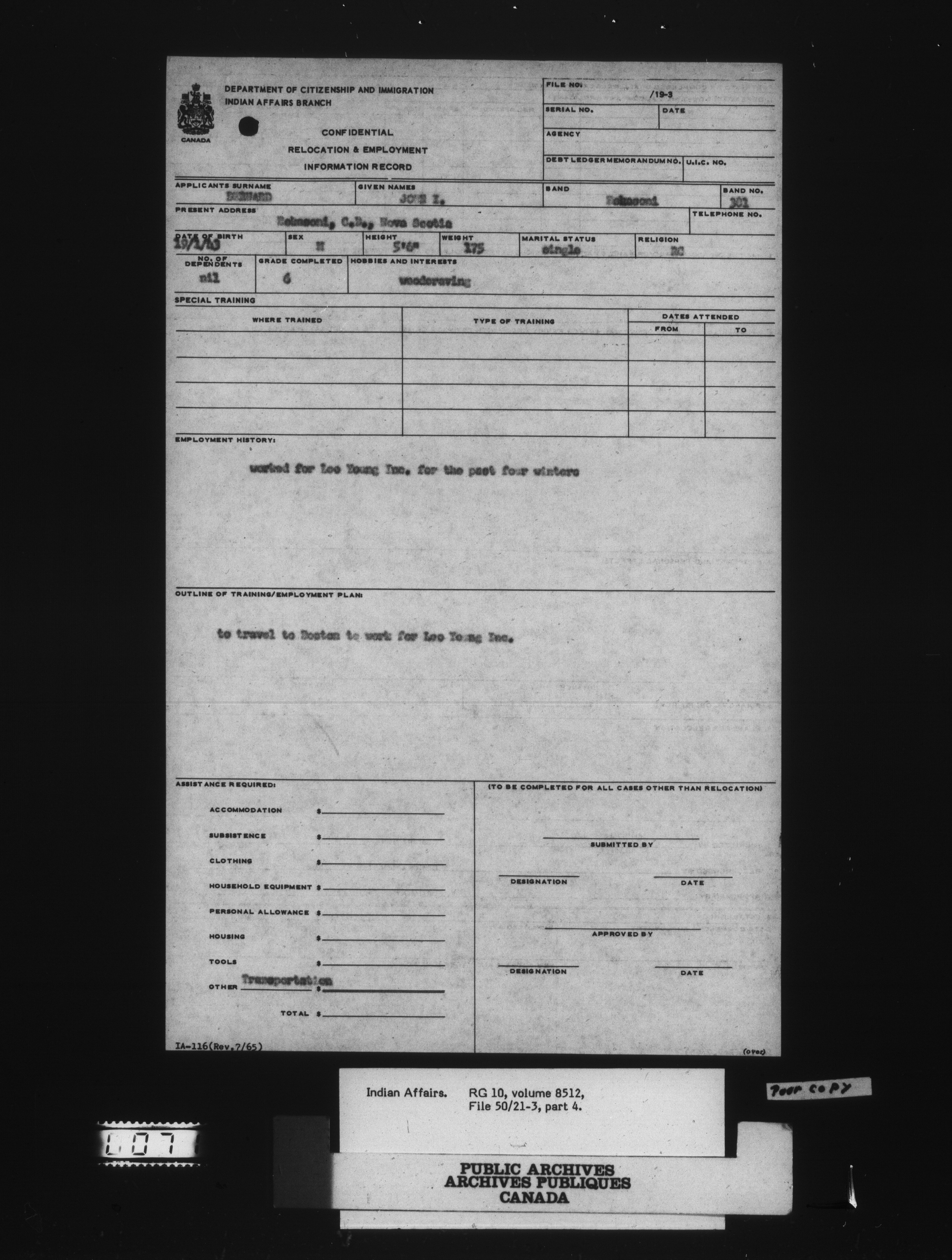Eskasoni Agency - Relocation of Indians to Employment - pt 1 to pt 4
