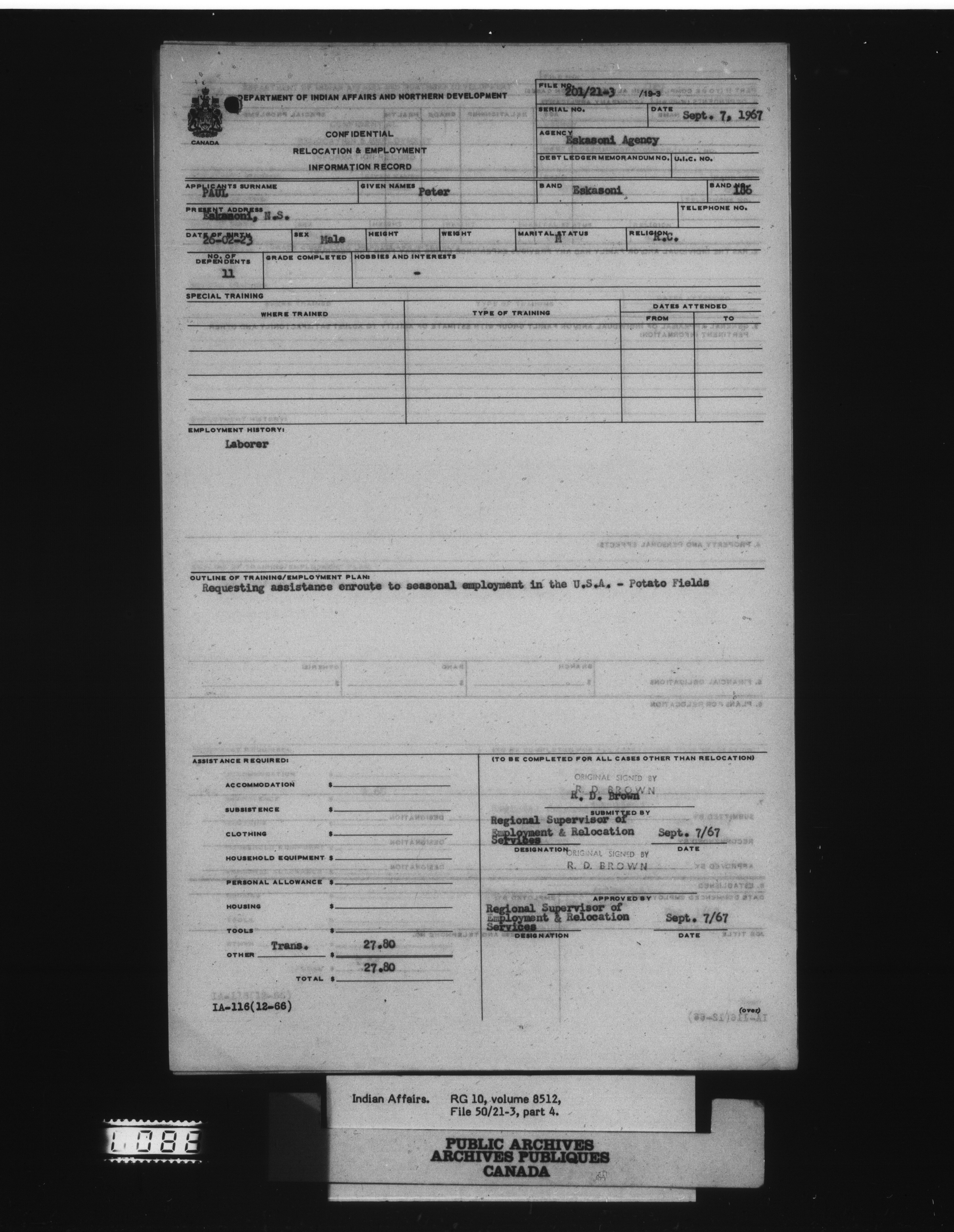 Eskasoni Agency - Relocation of Indians to Employment - pt 1 to pt 4