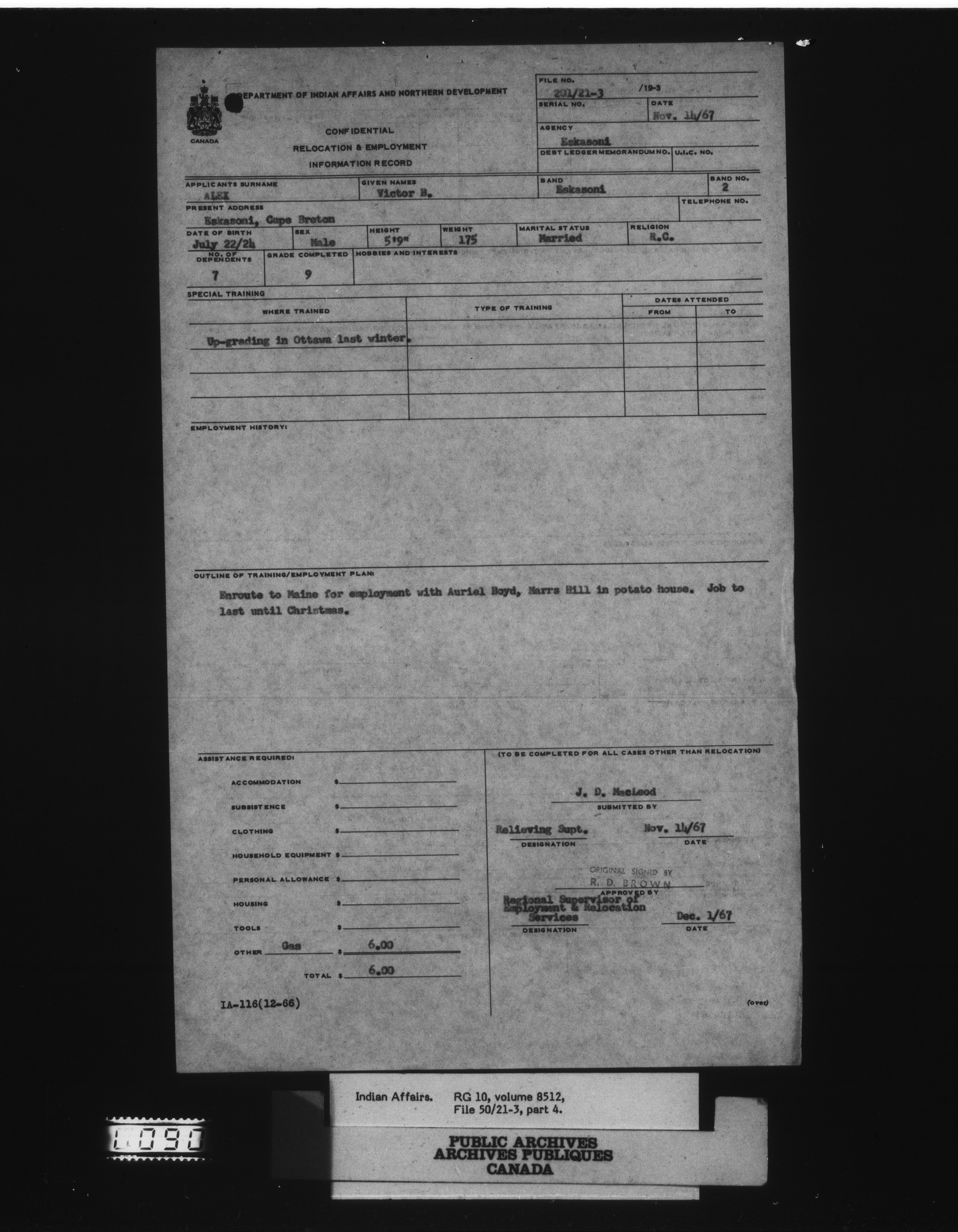Eskasoni Agency - Relocation of Indians to Employment - pt 1 to pt 4