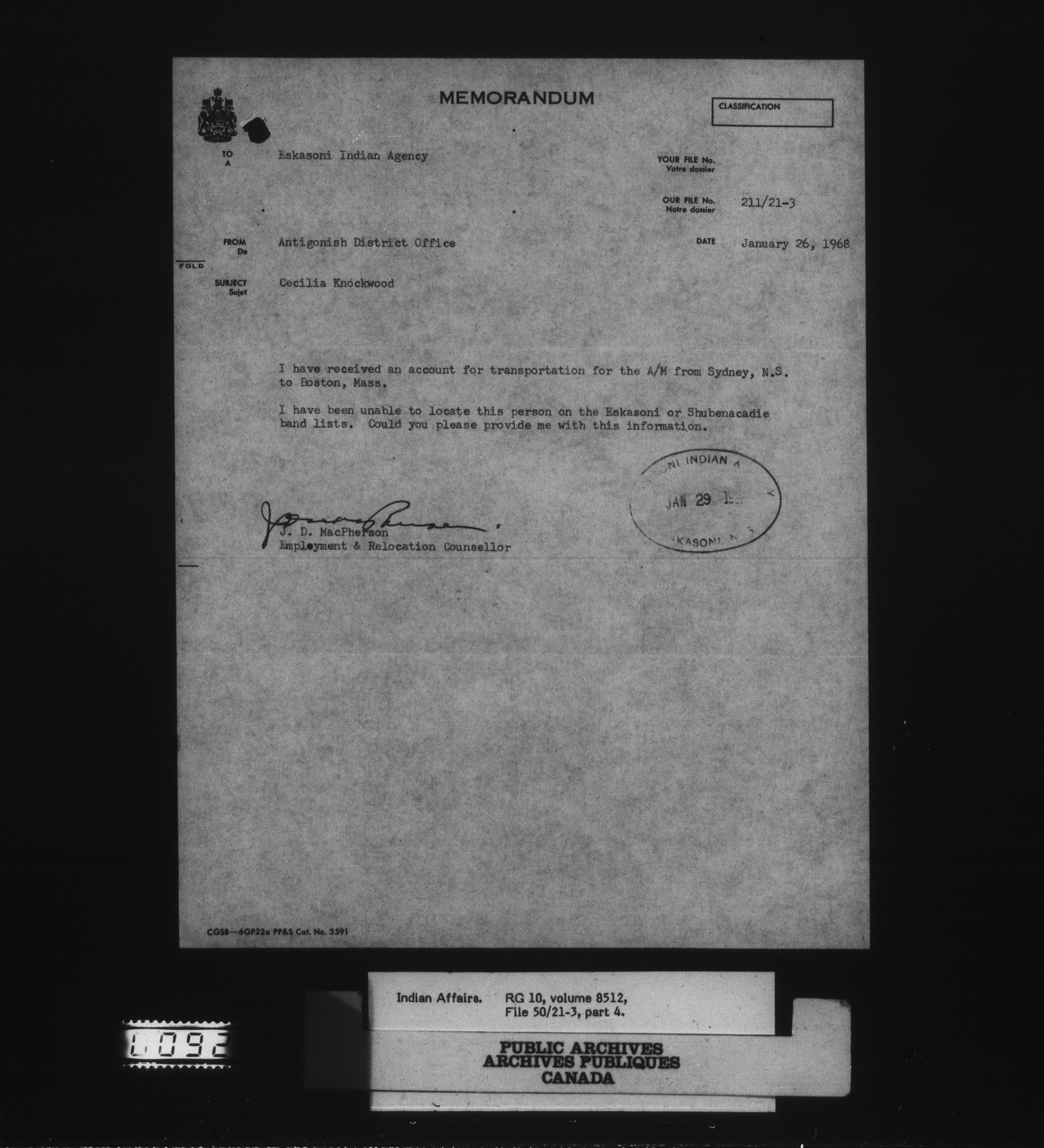 Eskasoni Agency - Relocation of Indians to Employment - pt 1 to pt 4