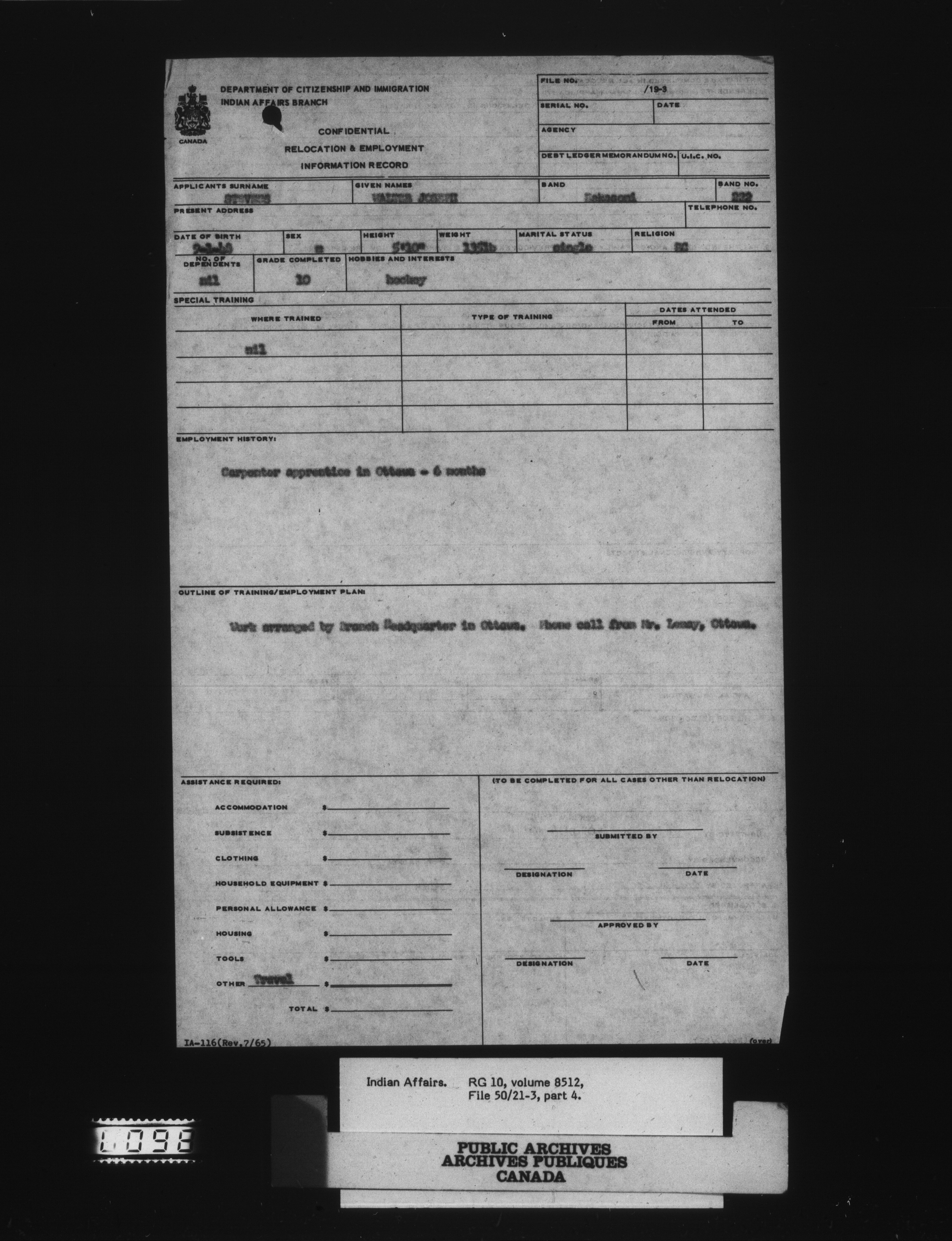 Eskasoni Agency - Relocation of Indians to Employment - pt 1 to pt 4
