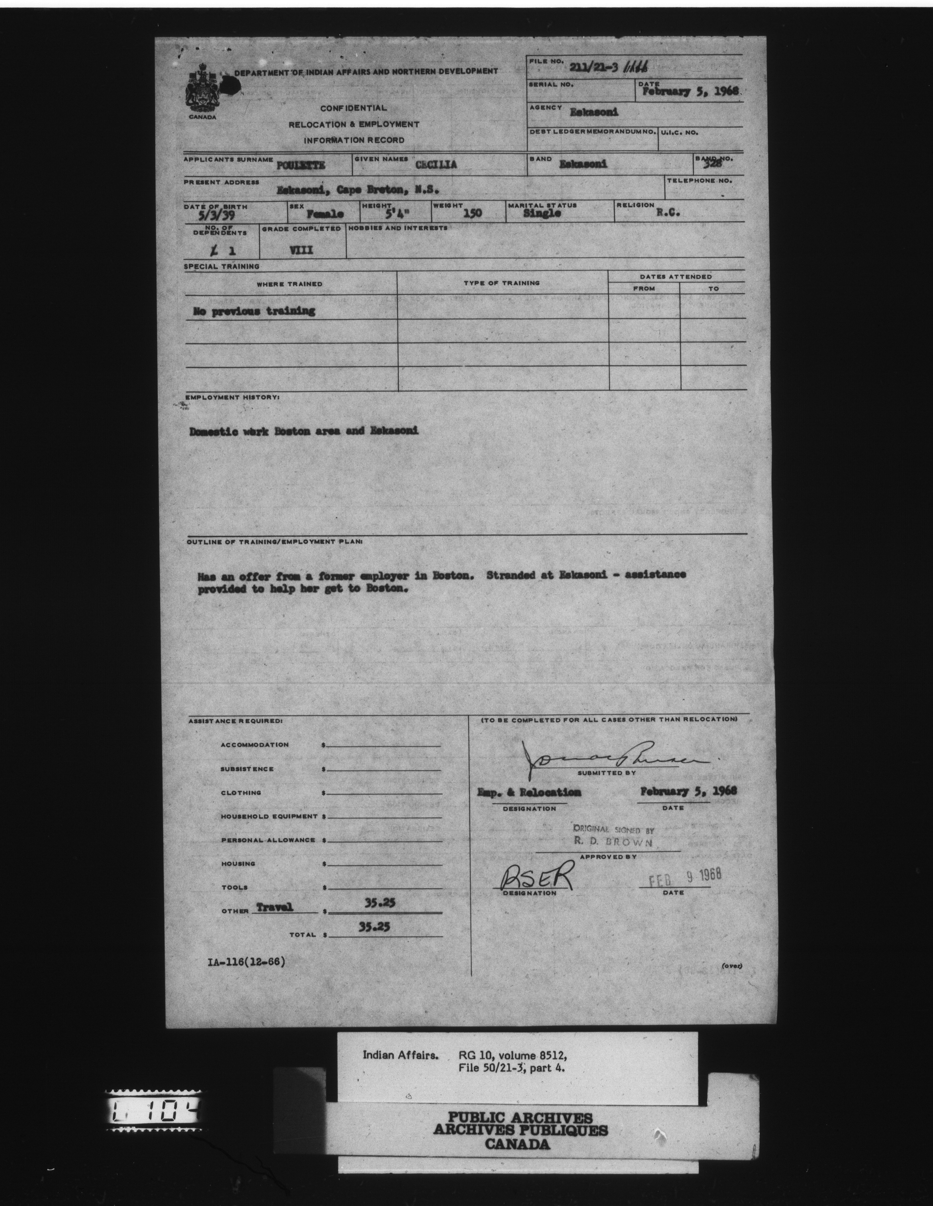 Eskasoni Agency - Relocation of Indians to Employment - pt 1 to pt 4