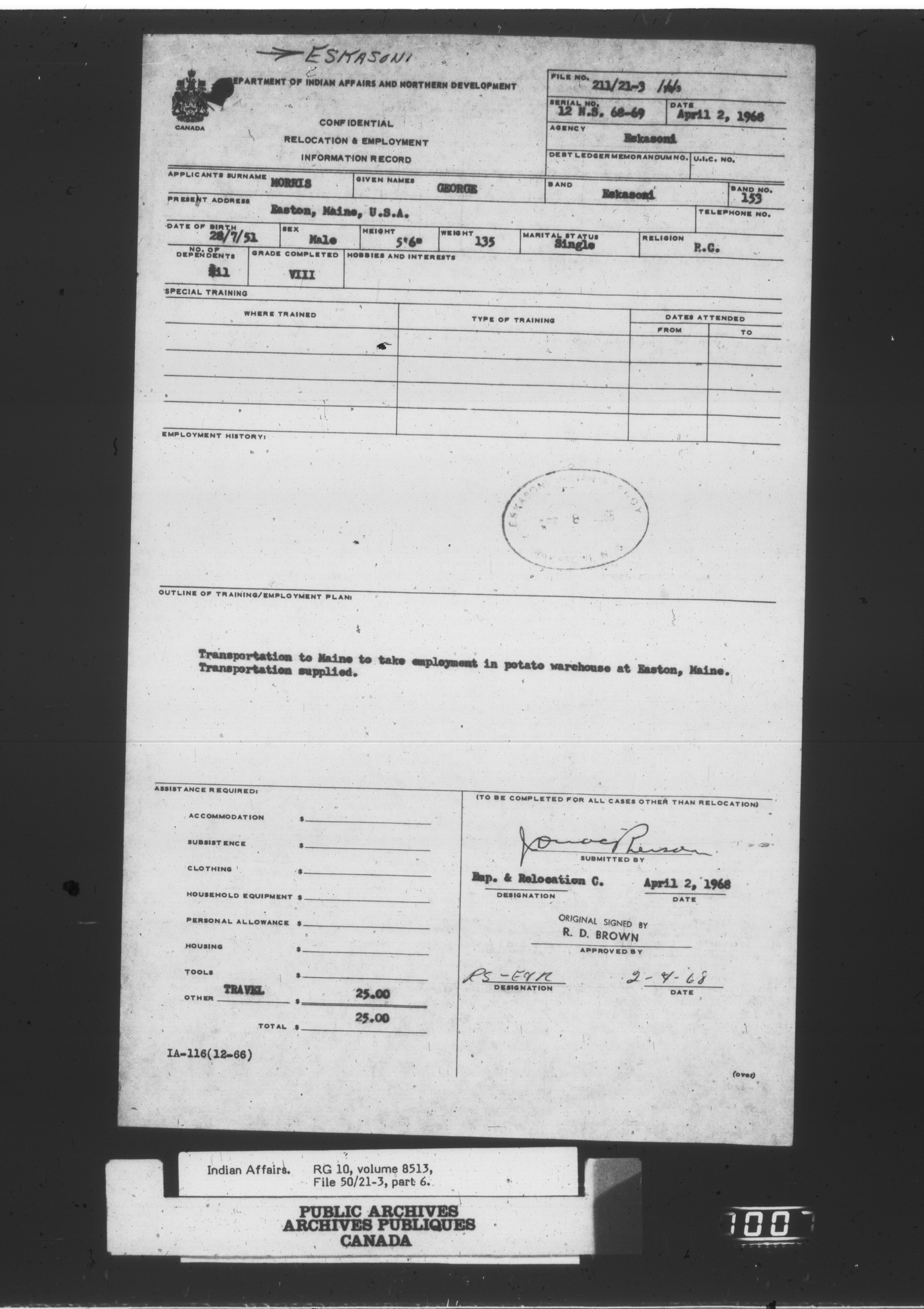 Eskasoni Agency - Relocation of Indians to Employment - pt 5 to pt 7