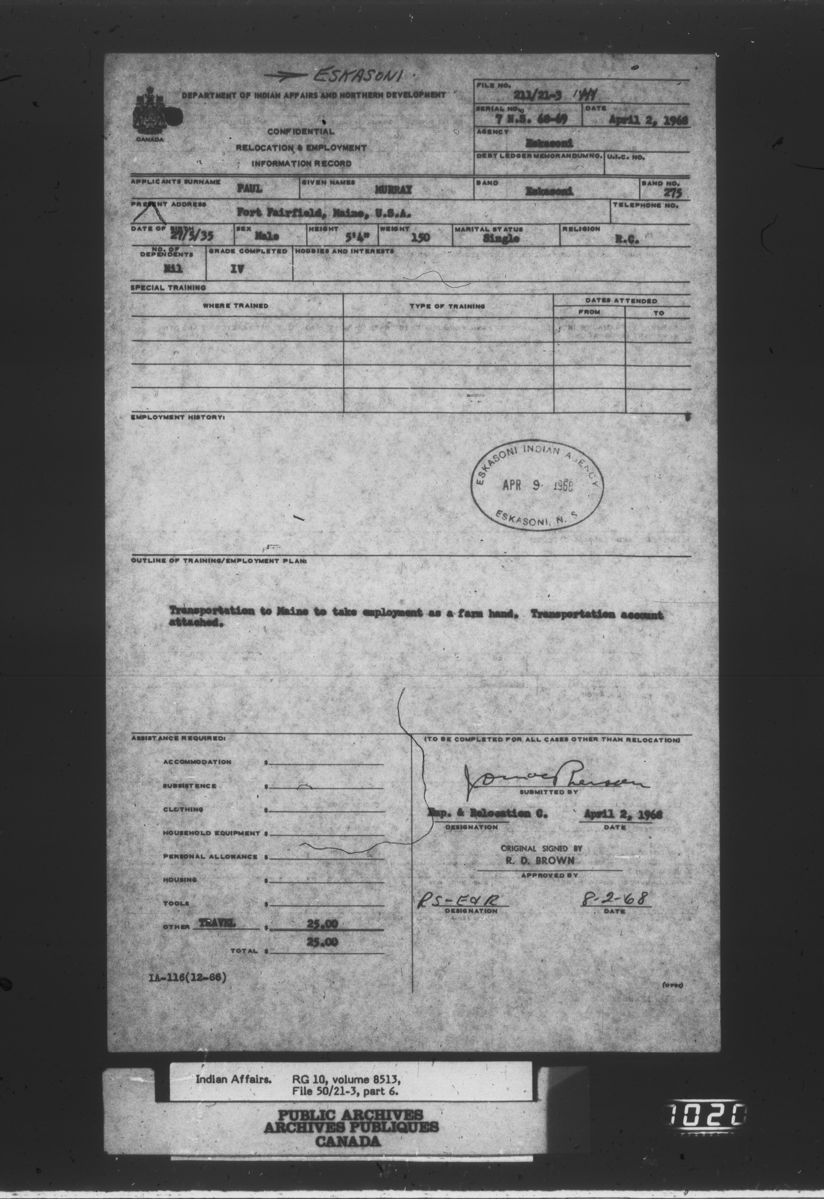 Eskasoni Agency - Relocation of Indians to Employment - pt 5 to pt 7